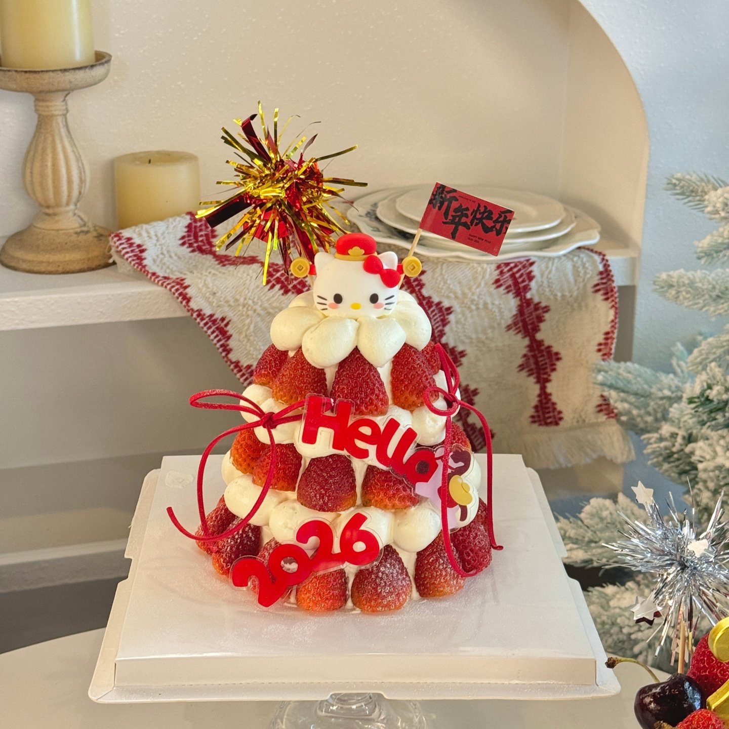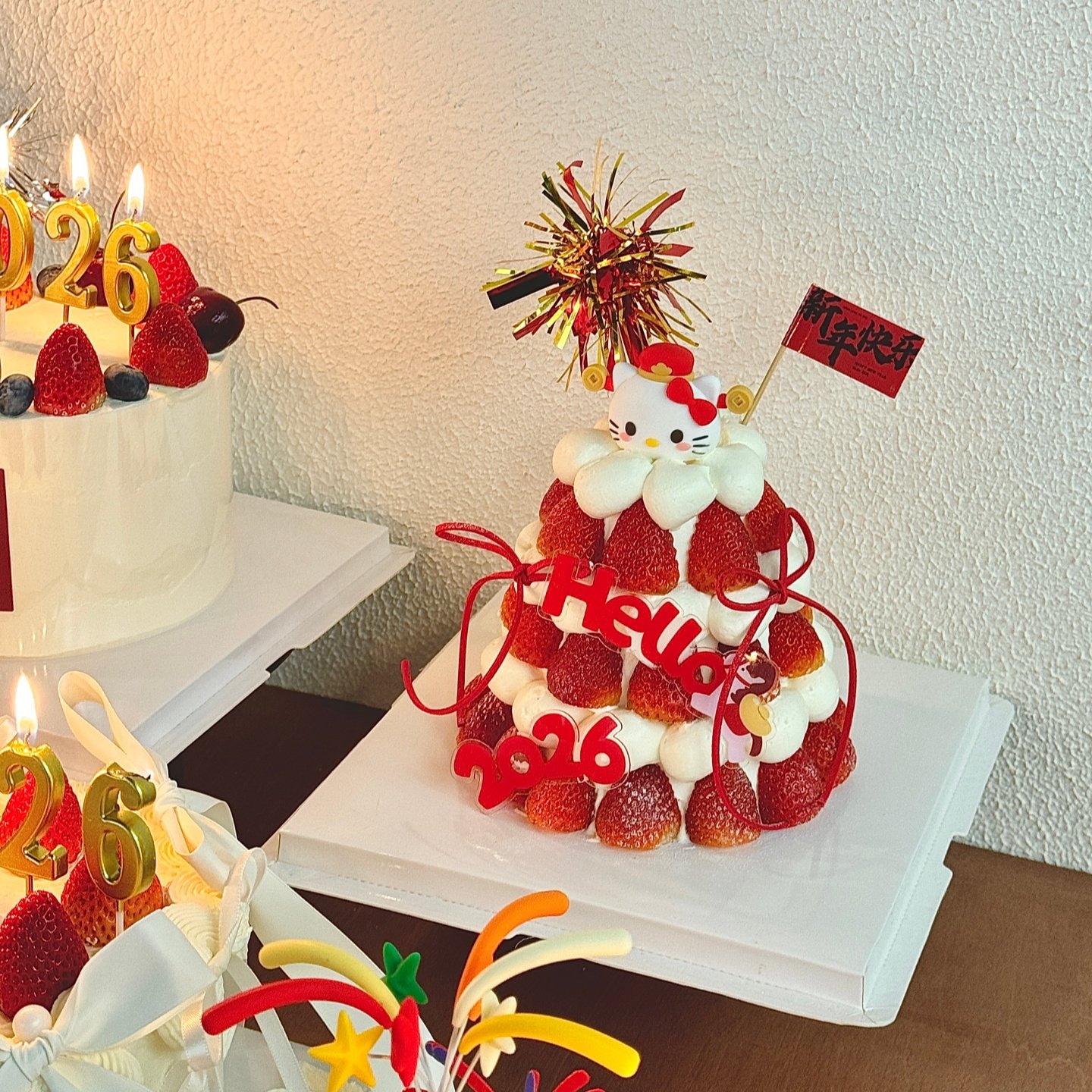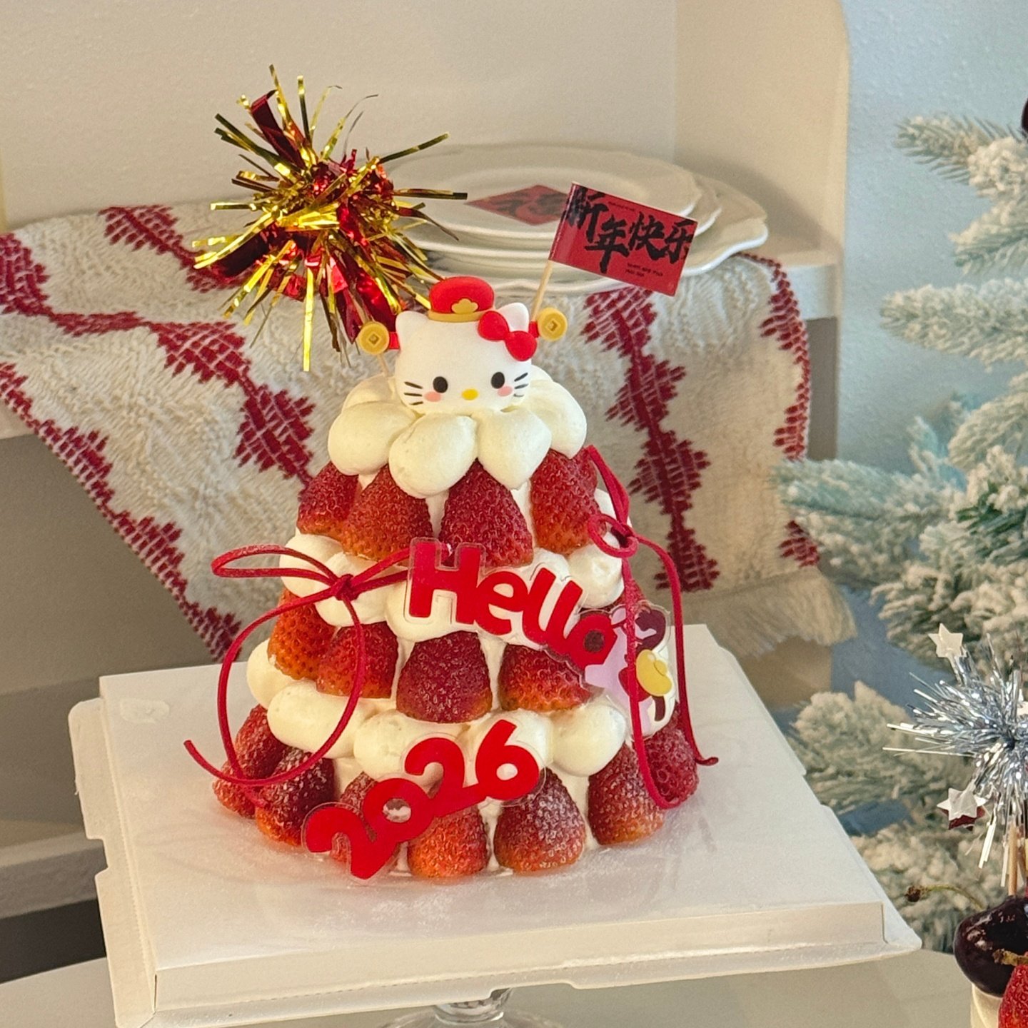 网红新年快乐草莓塔财神kt猫蛋糕装饰插旗你好2026亚克力烘焙插件