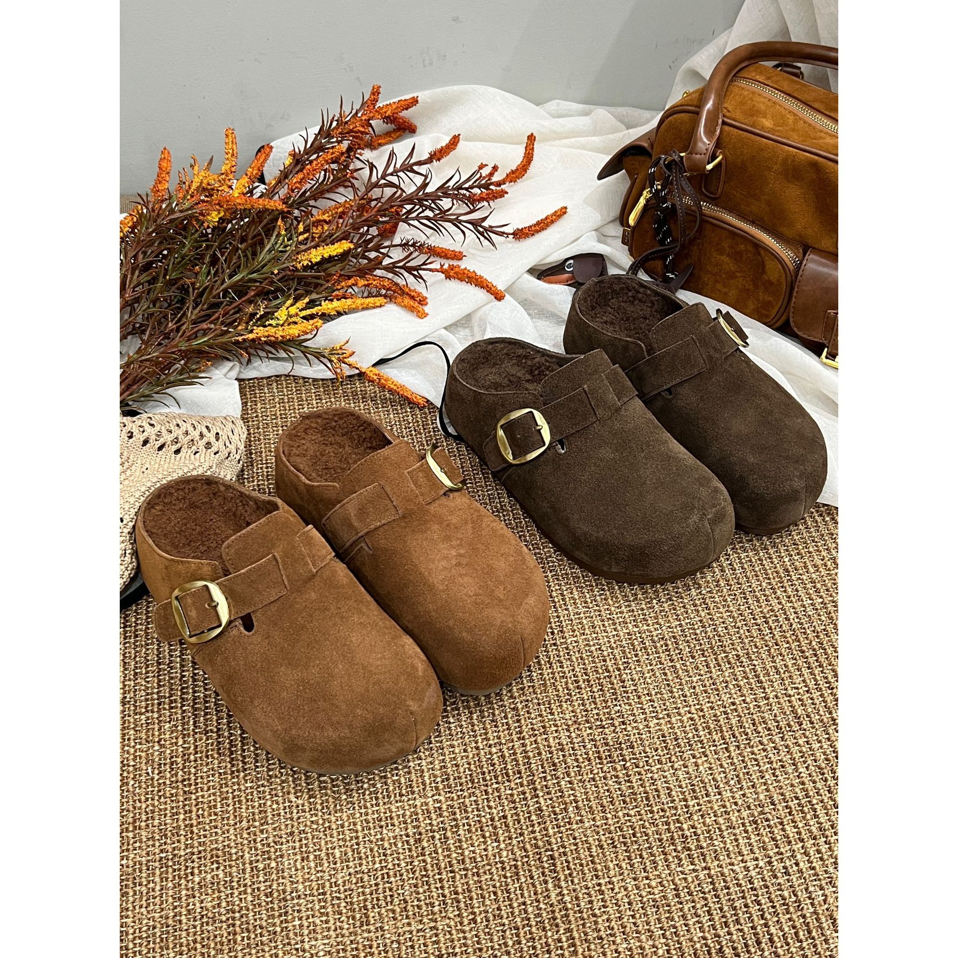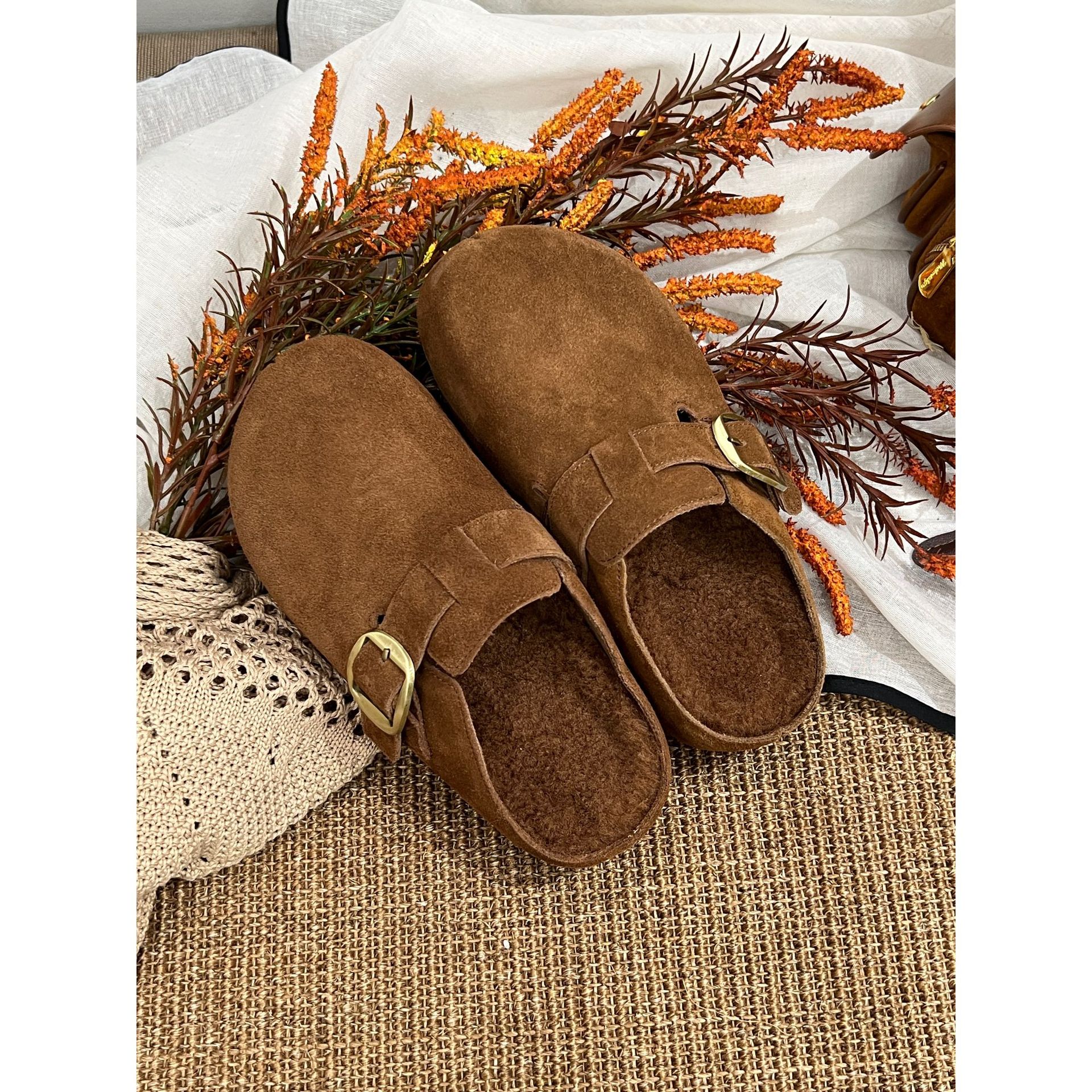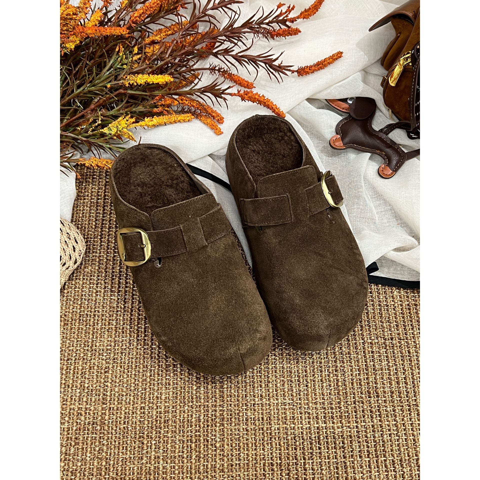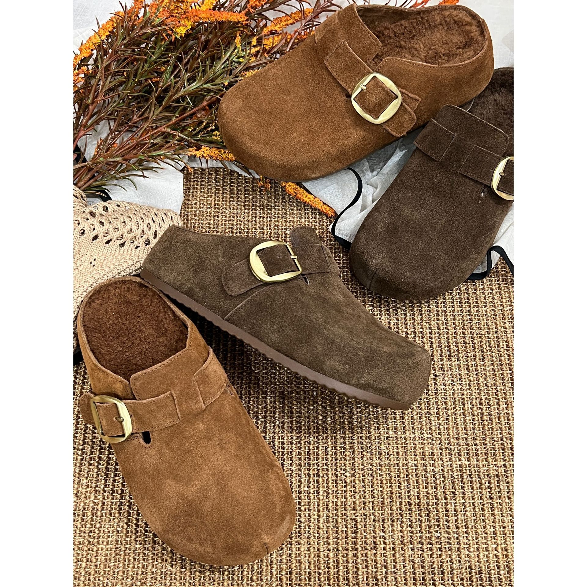复古懒人休闲百搭勃肯鞋女2025秋季新款真皮一脚蹬厚底包头半