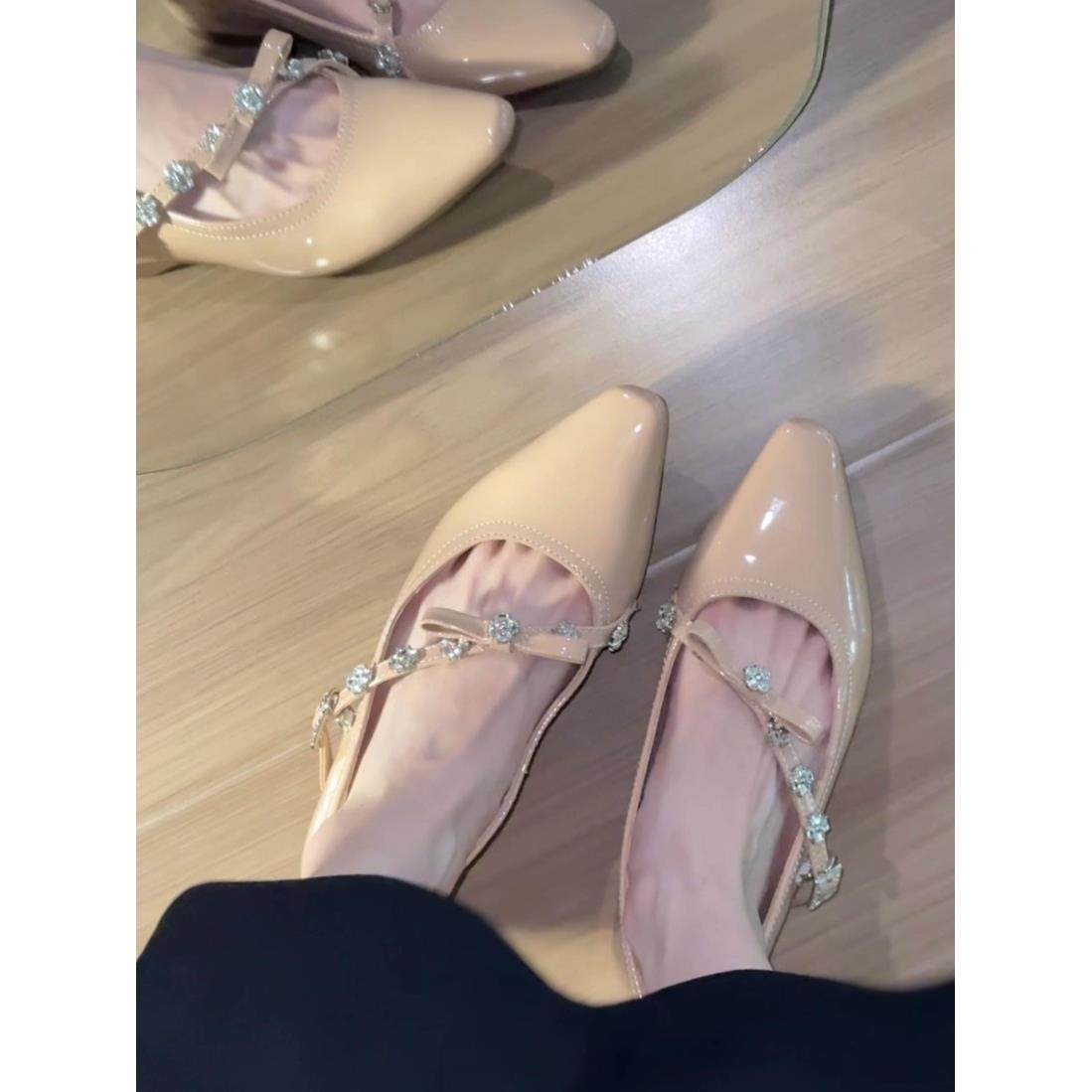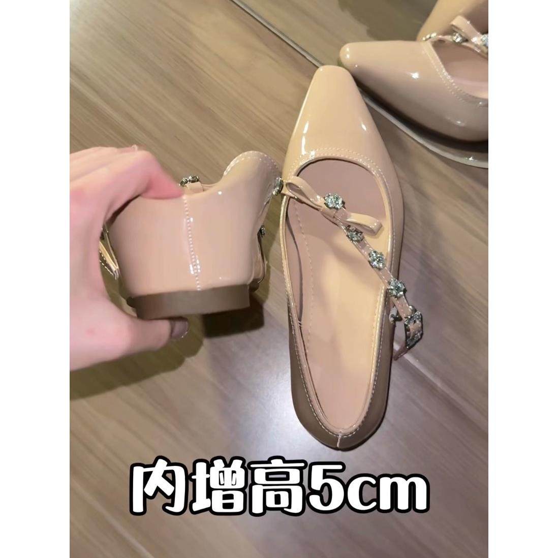 内增高5cm裸色法式尖头蝴蝶结气质通勤单鞋女一字带浅口玛丽珍鞋