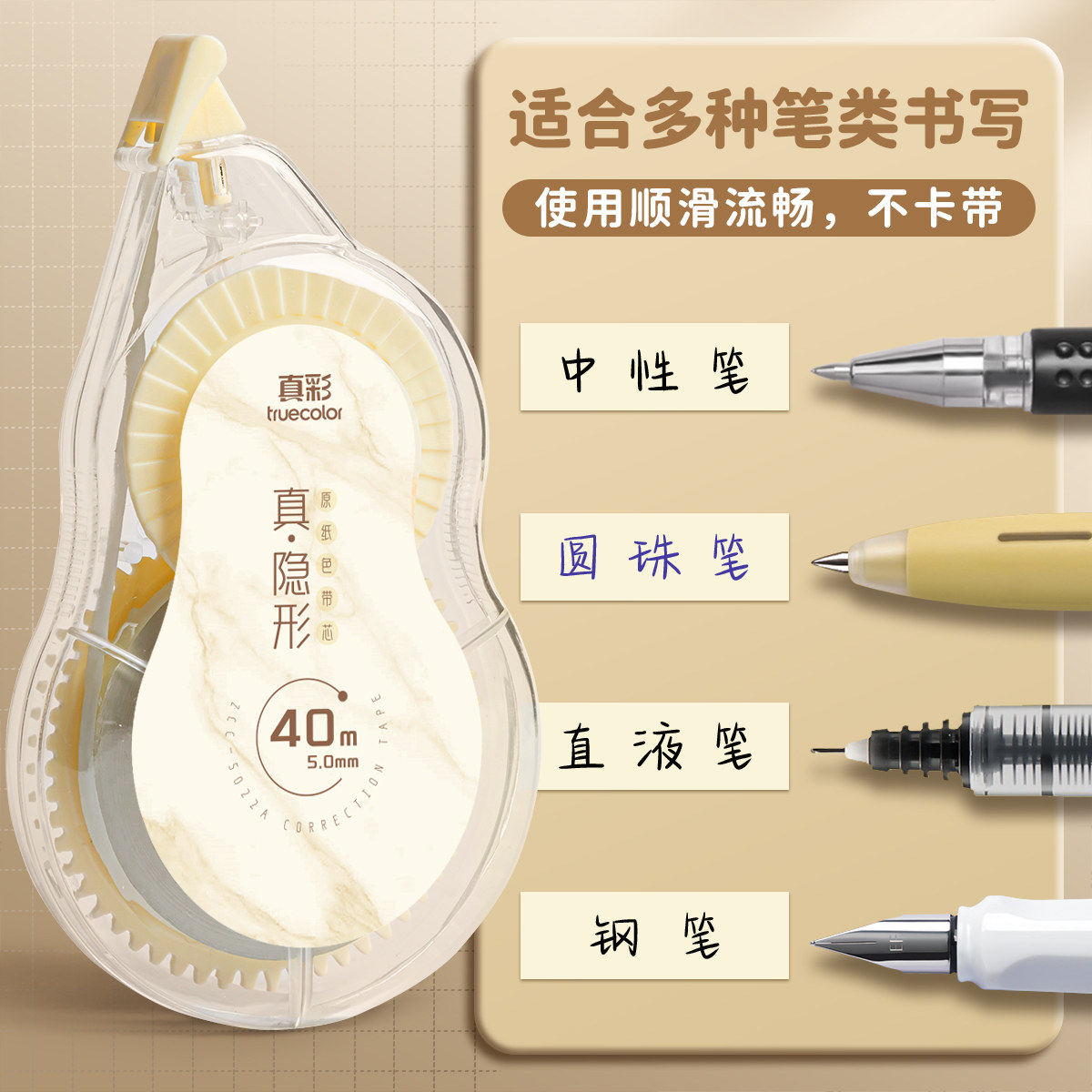 真彩米黄色修正带原纸色学生用顺滑涂改带改正带小学生专用大容量初中生涂改文具隐形白色速干改错带静音
