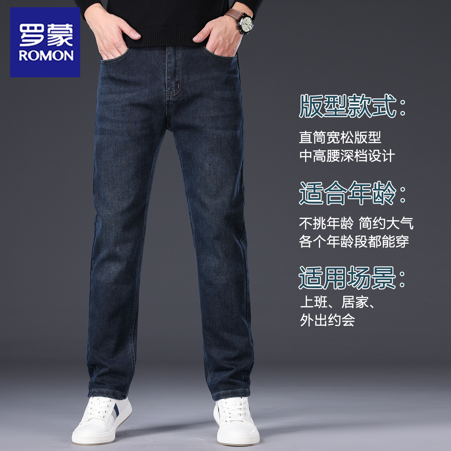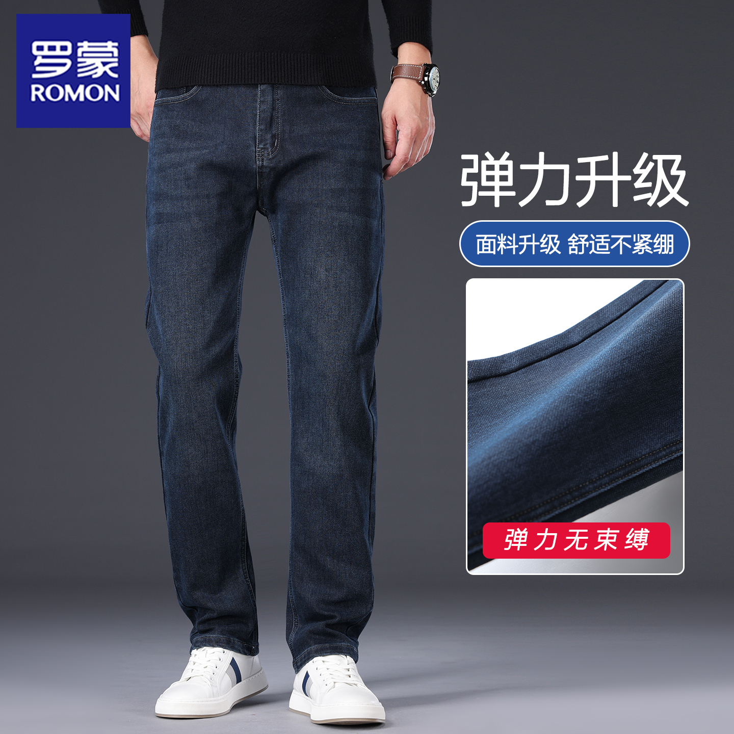 罗蒙高端牛仔裤男弹力直筒商务休闲高腰深裆爸爸装秋冬加绒加厚