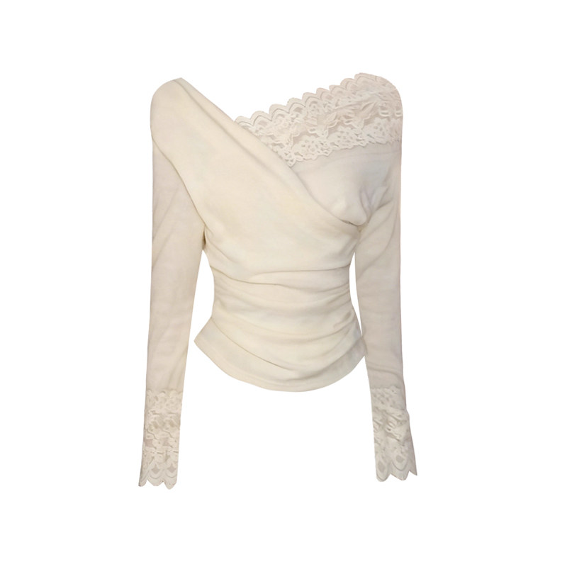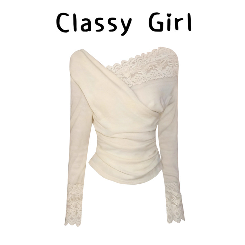 设计感交叉V领蕾丝拼接斜肩上衣女秋冬修身收腰气质百搭长袖上衣