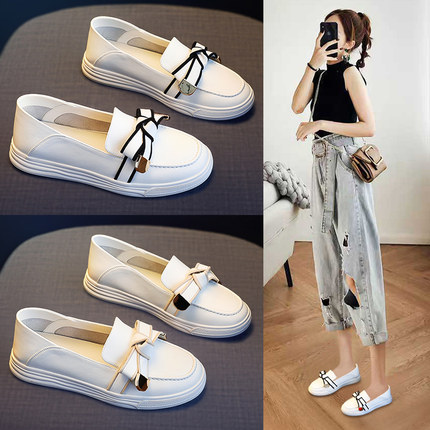 小白鞋女2025新款平底单鞋配裙一脚蹬女鞋子夏季孕妇休闲真皮鞋秋