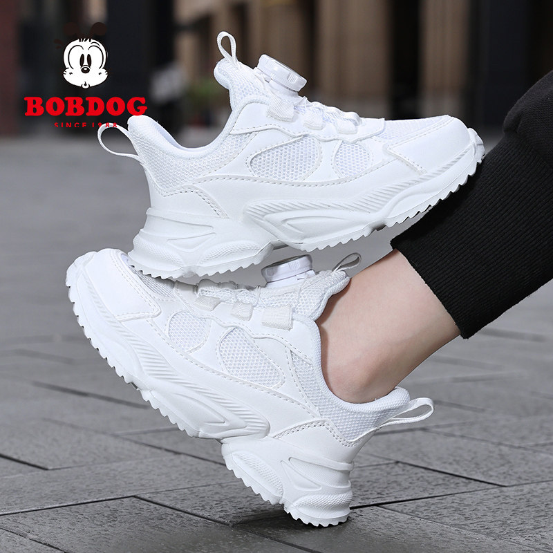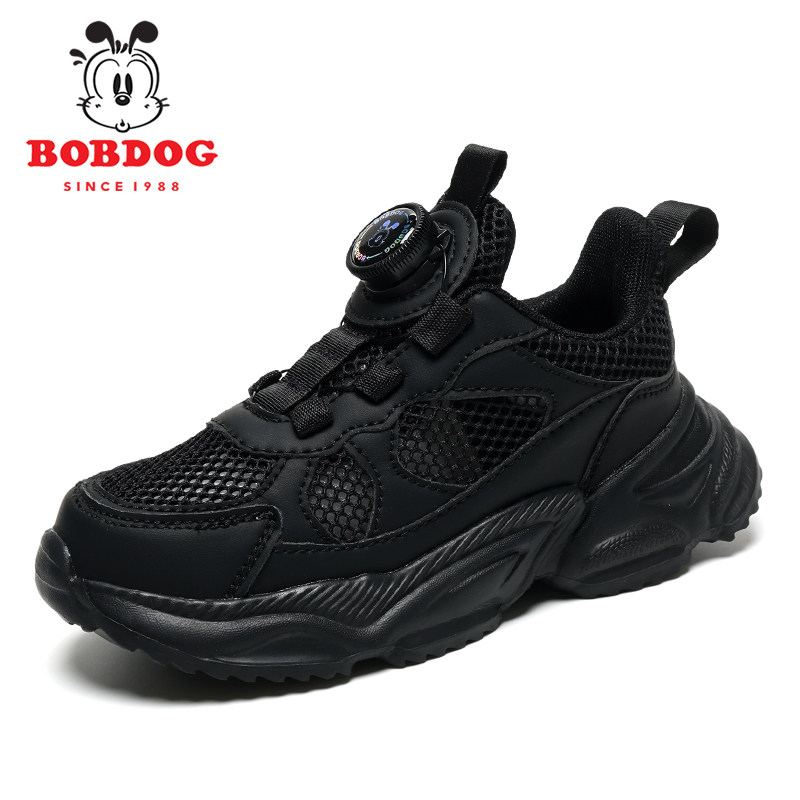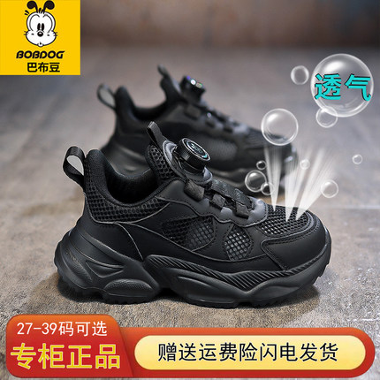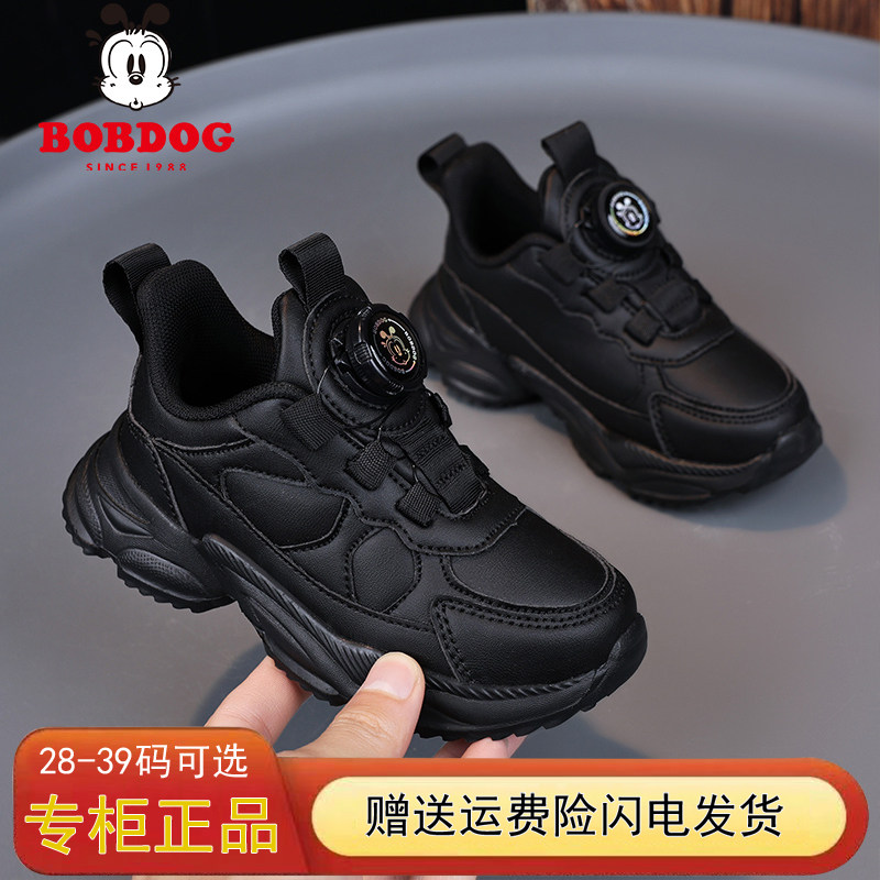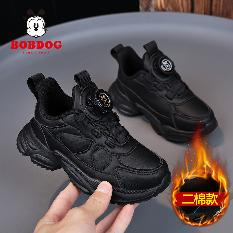 巴布豆童鞋男童小黑鞋纽扣儿童黑色运动鞋秋冬皮面女孩棉鞋跑步鞋