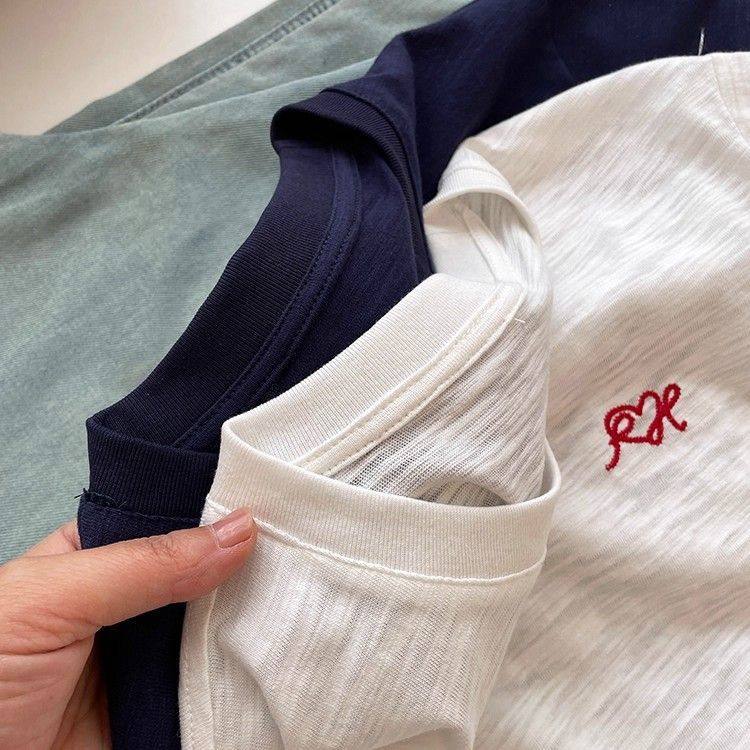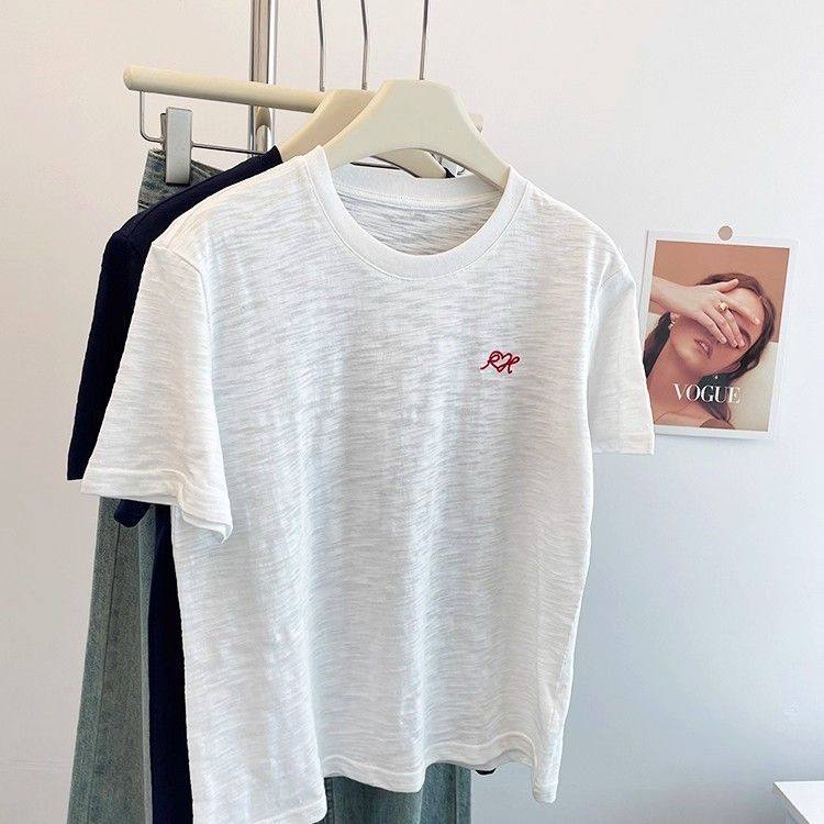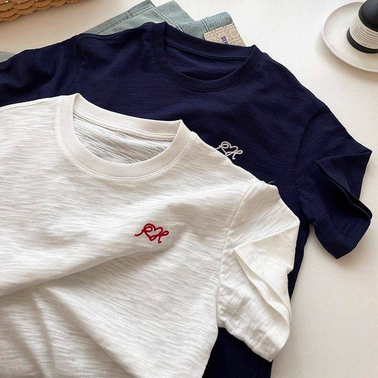 夏季清凉透气竹节棉T恤简约减龄百搭精美刺绣宽松显瘦短袖女上衣