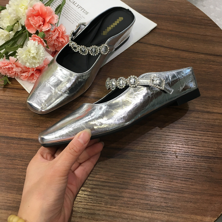 2025春新款真皮包头半拖鞋女外穿内增高银色凉拖甜美水钻法式单鞋