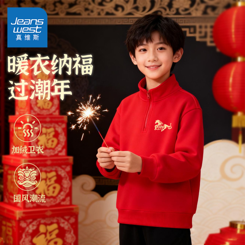 真维斯童装男童红色加绒卫衣冬季男孩打底衫春秋大童洋气过年衣服