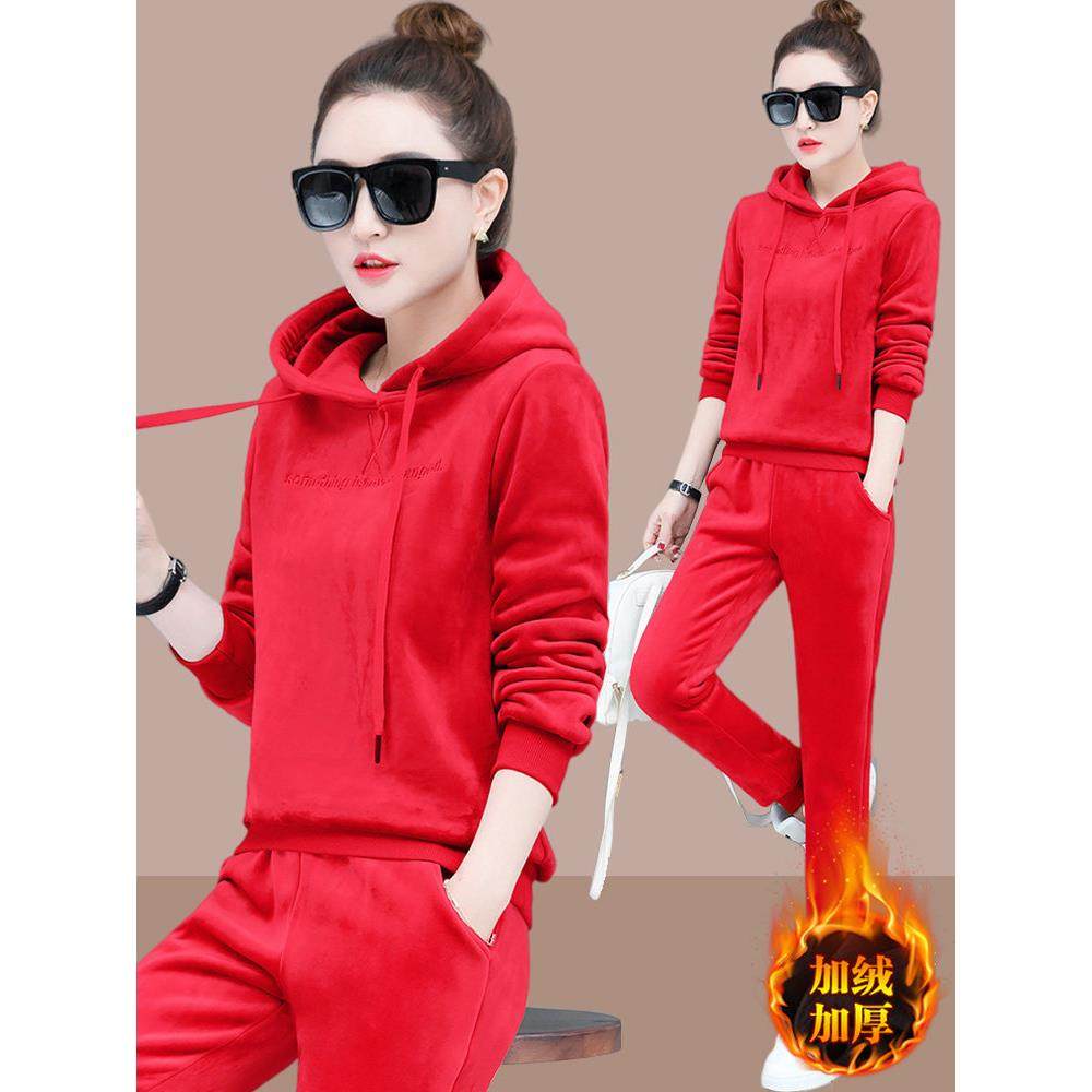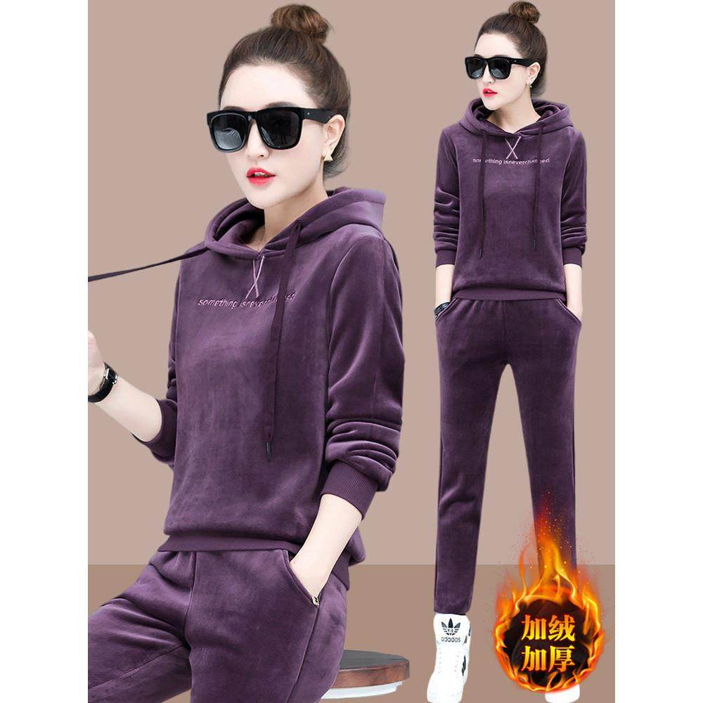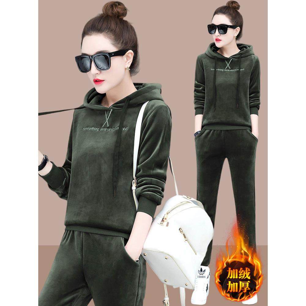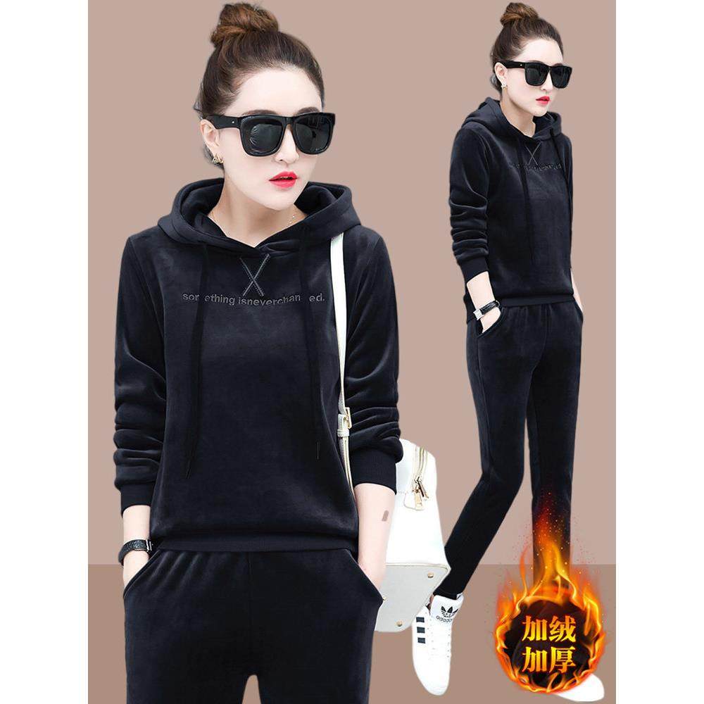 欧洲站时尚运动休闲卫衣加绒加厚两件套2025秋冬新款金丝绒套装女