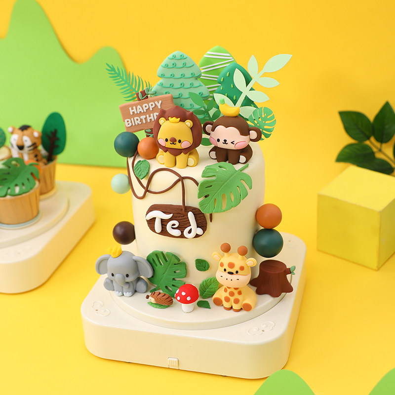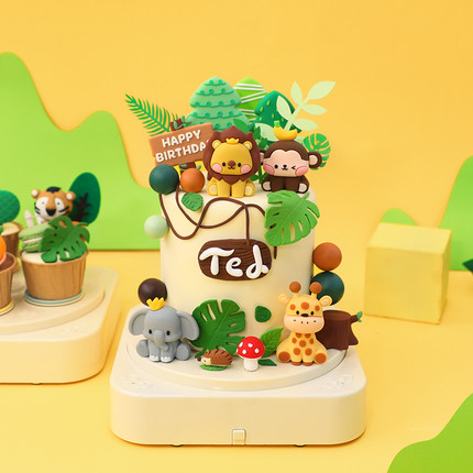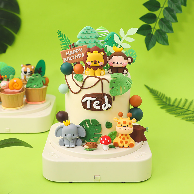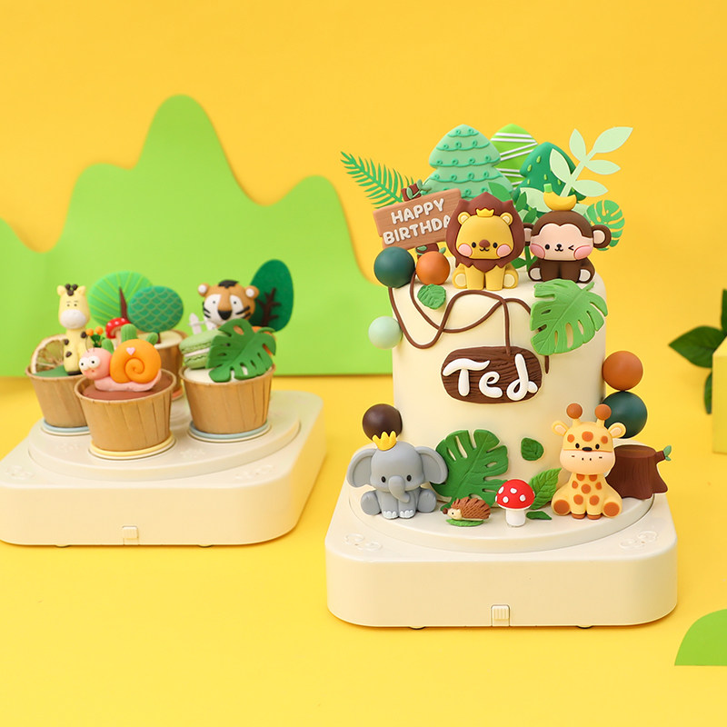 回转甜品转盘旋转木马机热带森系小动物软胶玩偶摆件纸杯蛋糕装饰