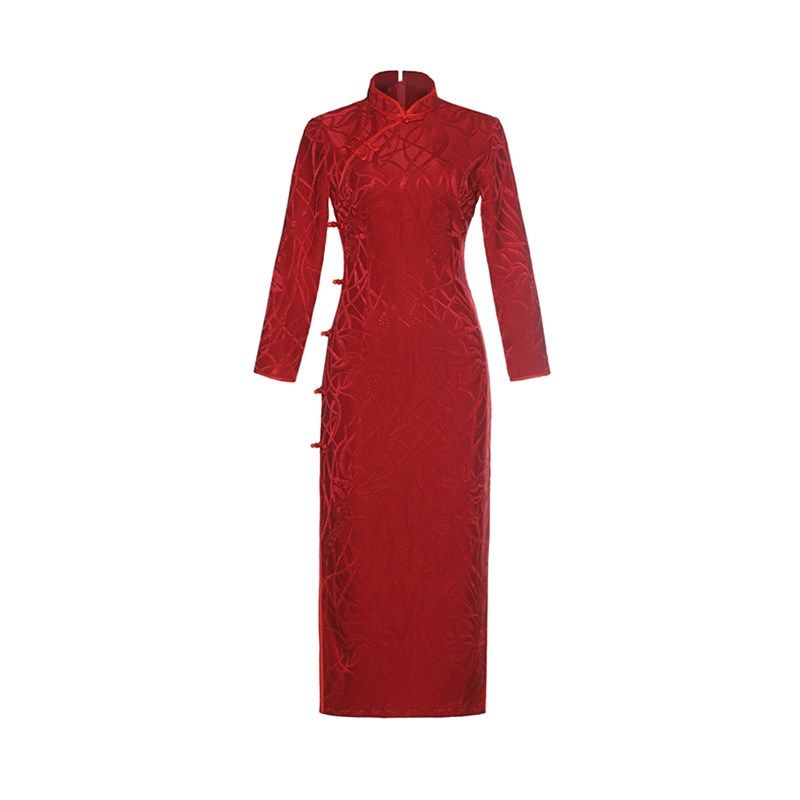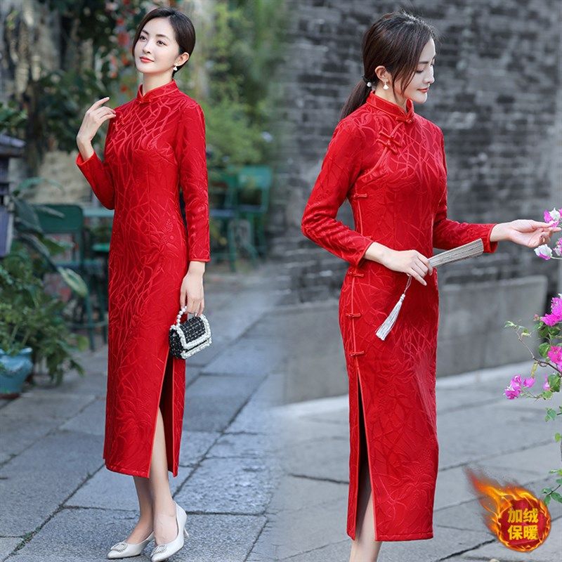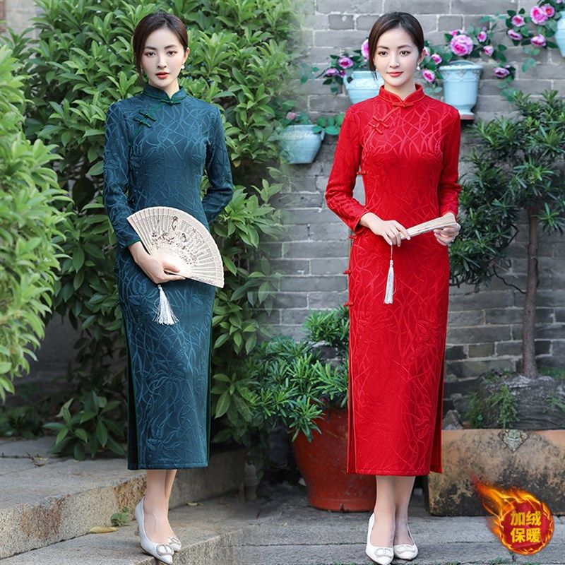 高档加绒加厚旗袍女长款中年妈妈装宴会喜婆婆复古改良旗袍裙礼服
