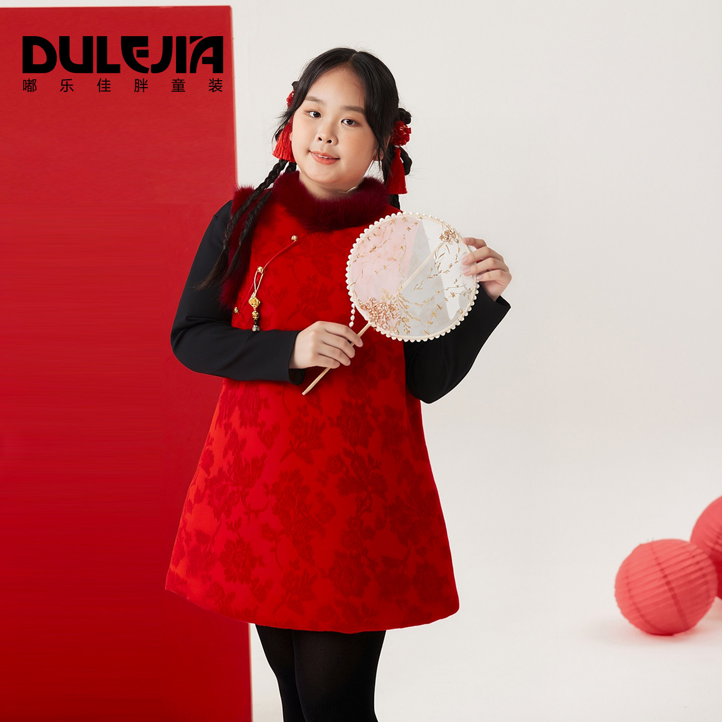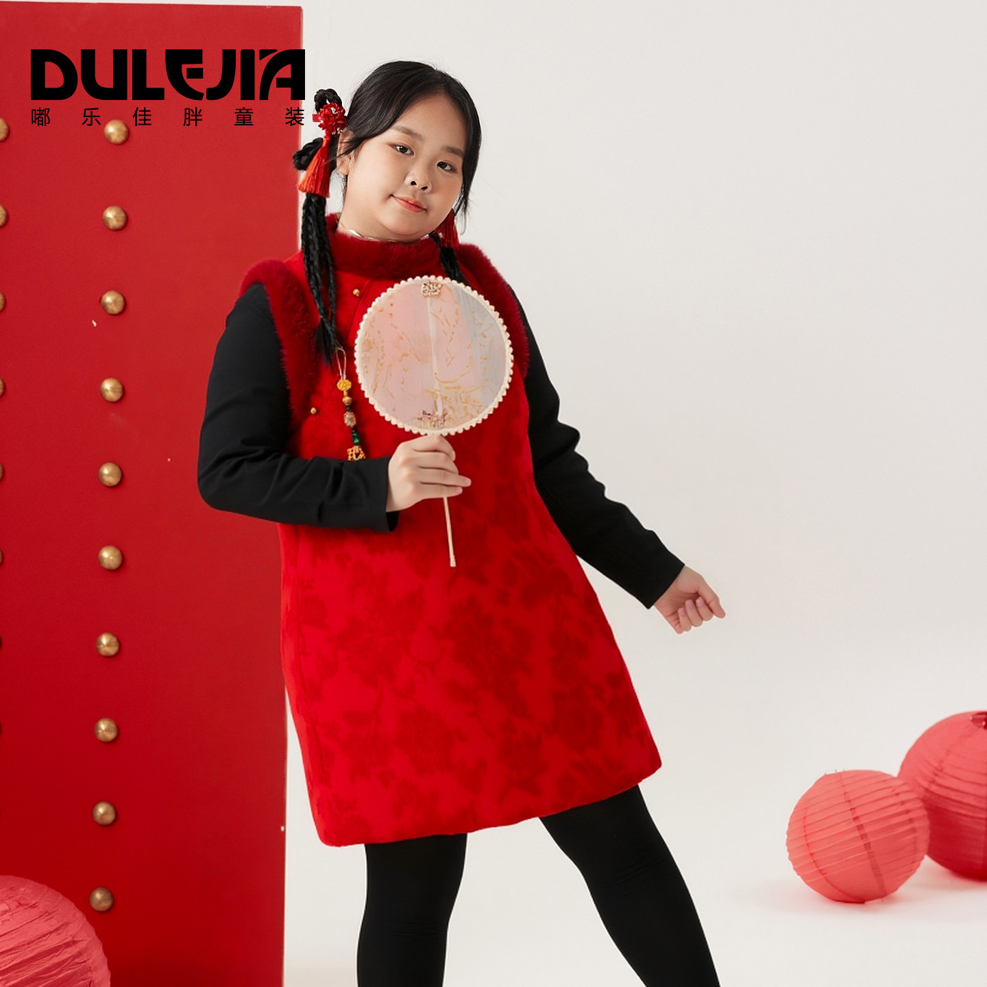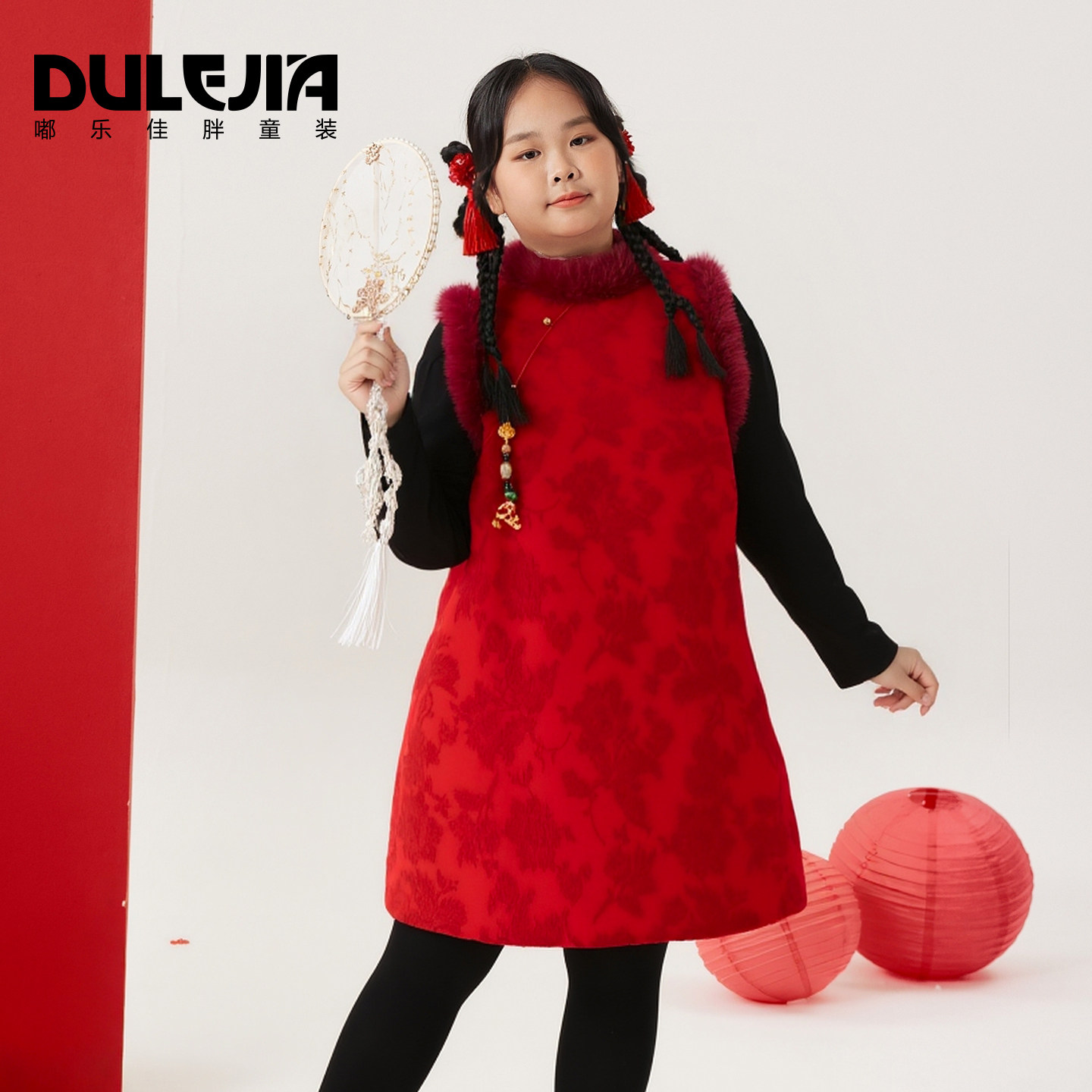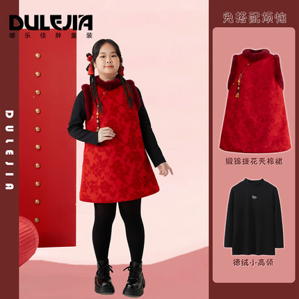 胖女童中国风连衣裙无袖加大码中大童加厚保暖春节新年装背心裙子