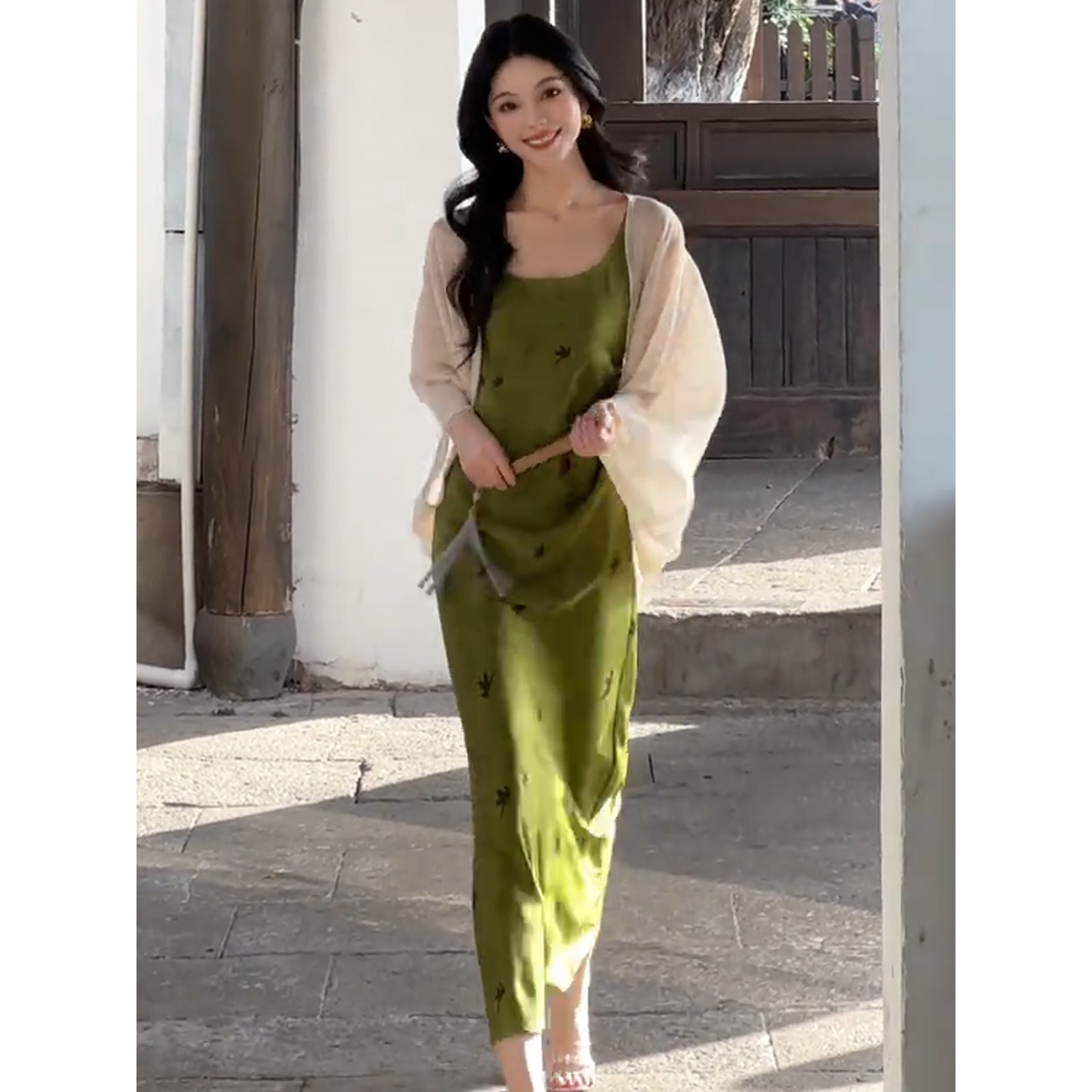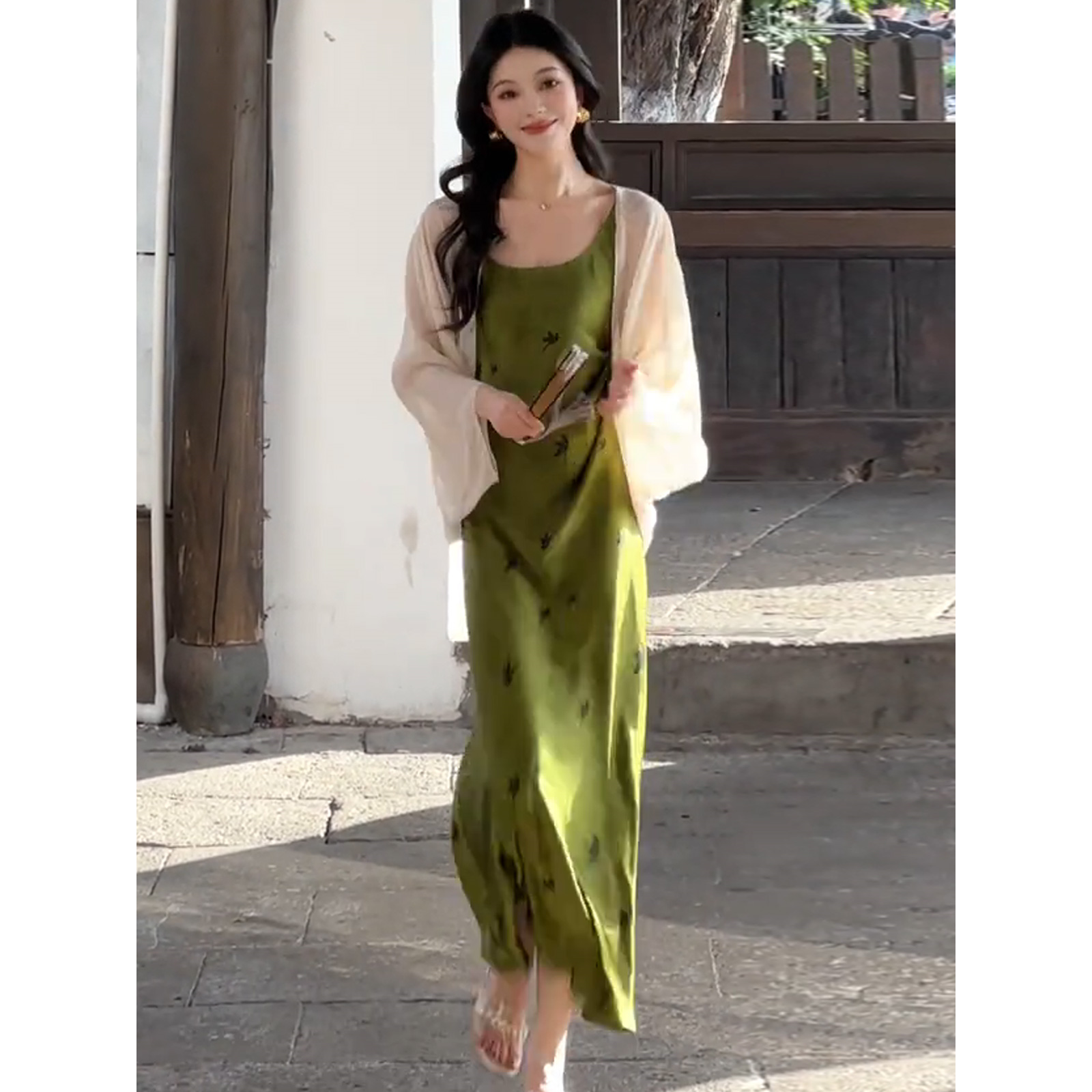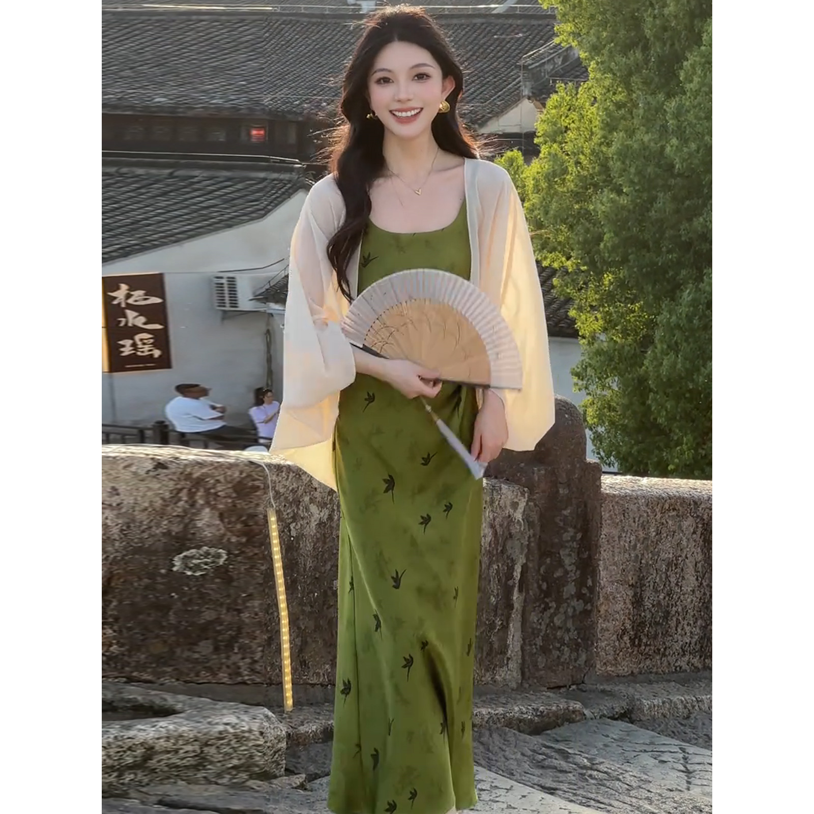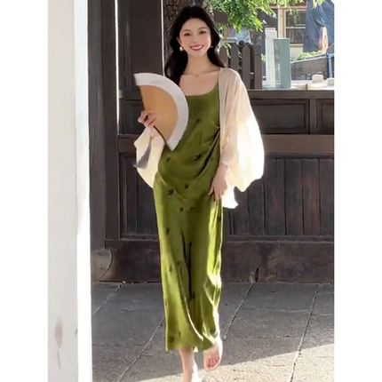 新中式禅意风缎面提花吊带连衣裙显瘦开衫套装夏穿搭轻奢高级感女