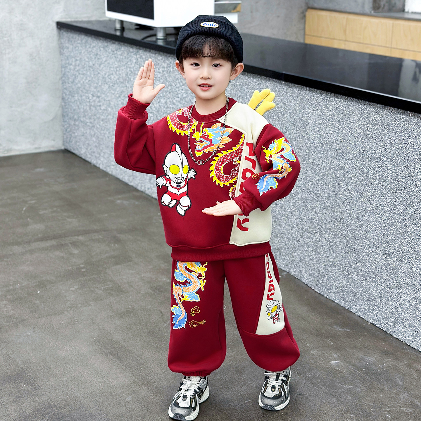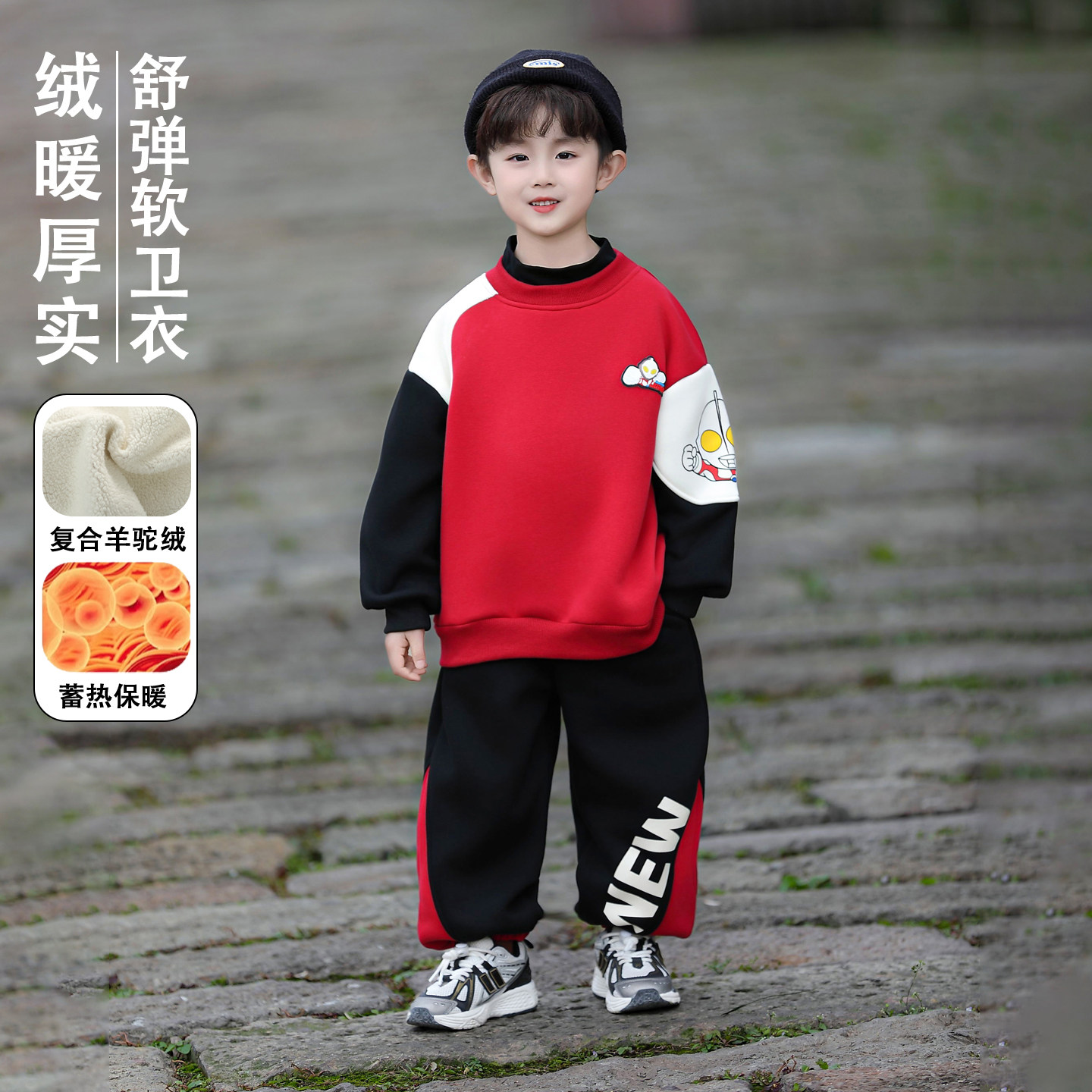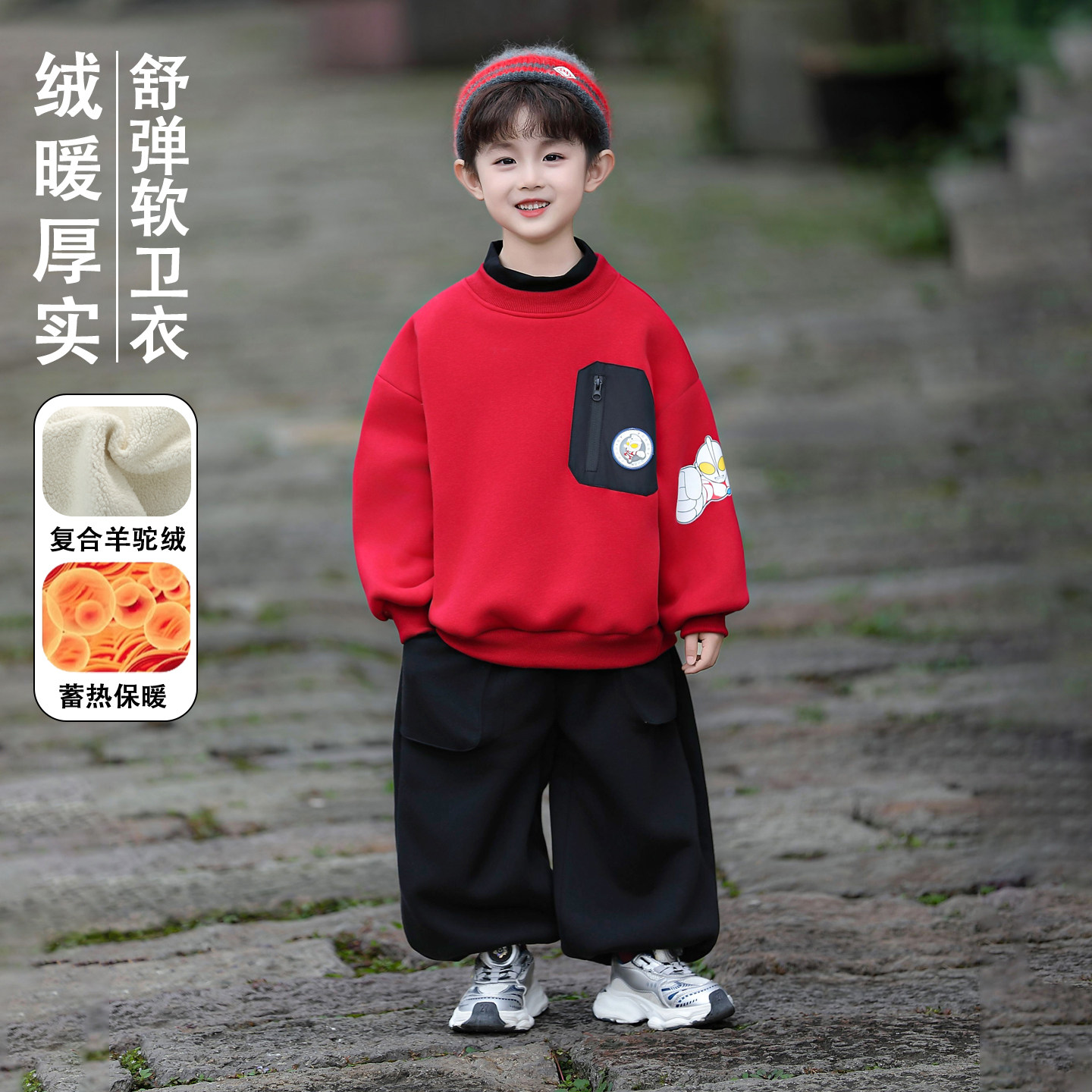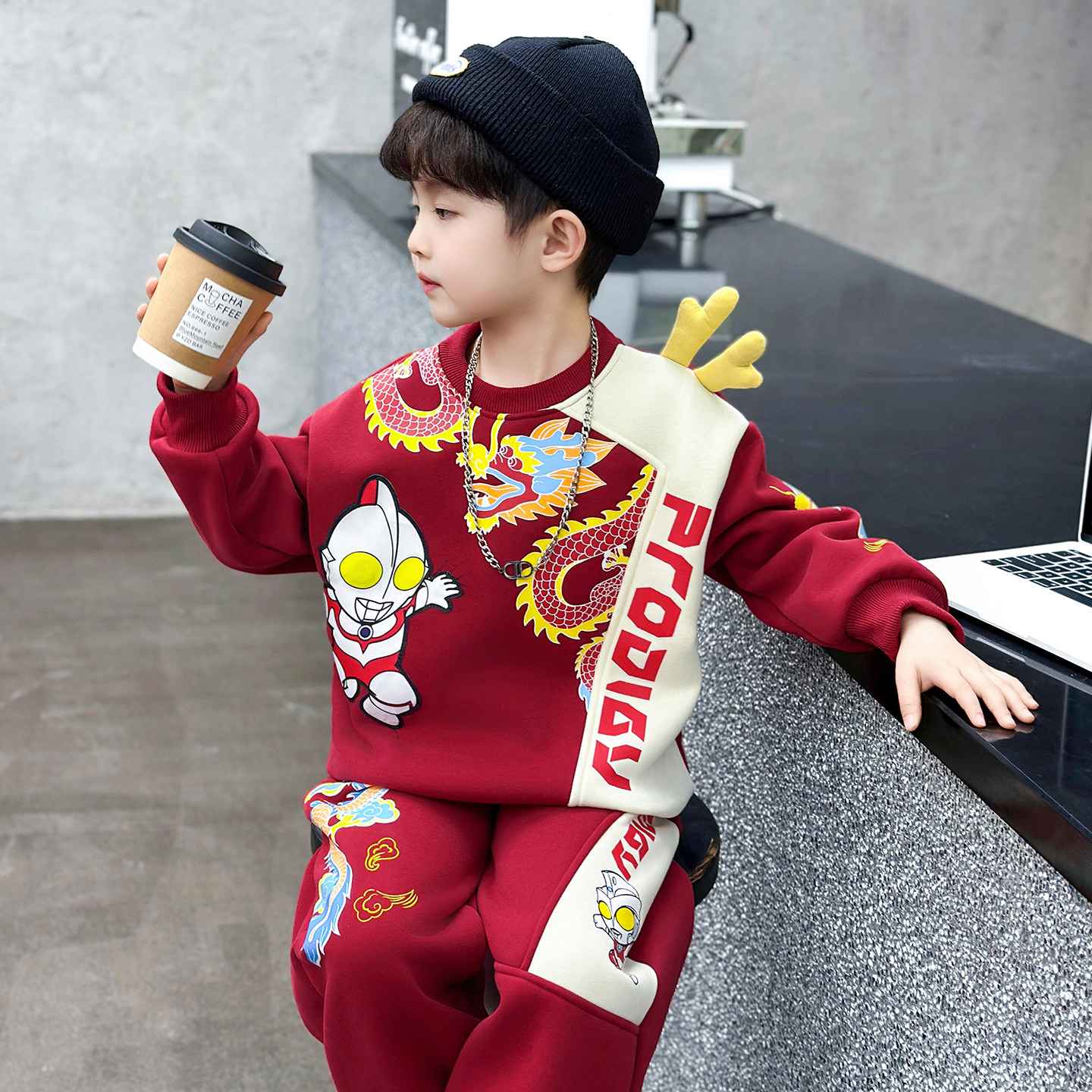 男童套装冬装红色加绒衣服帅气宝宝冬季拜年服儿童加厚卫衣奥特曼