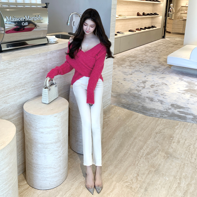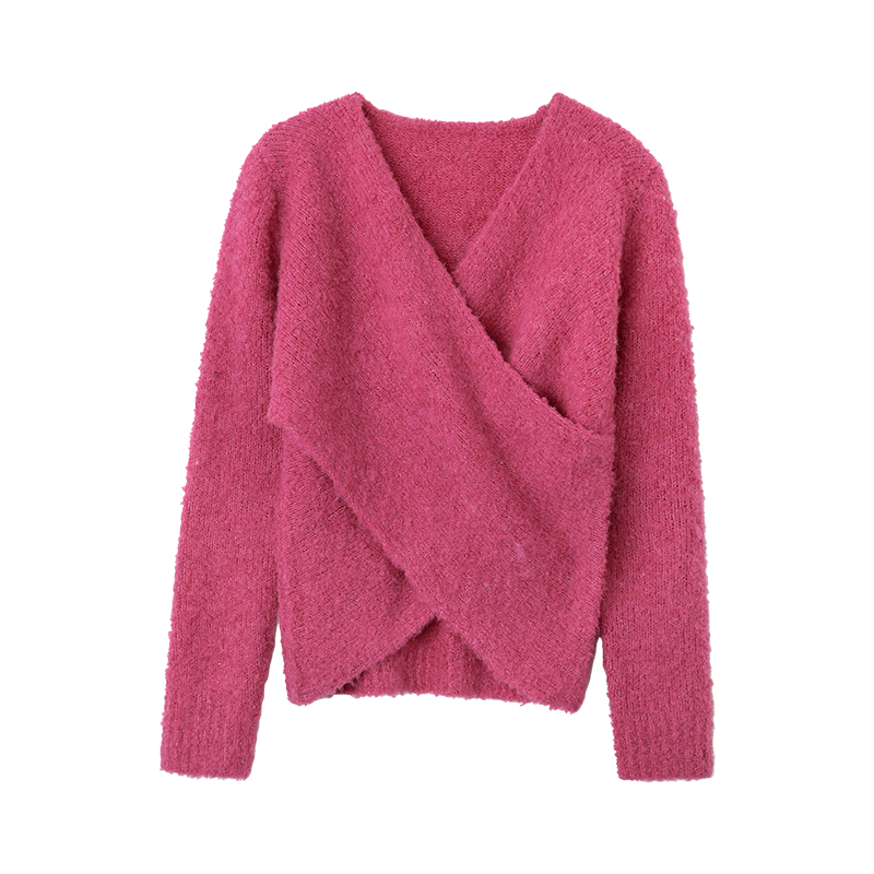 韩雨嘉玫红色v领修身毛衣针织衫女秋冬交叉设计感显瘦甜辣上衣