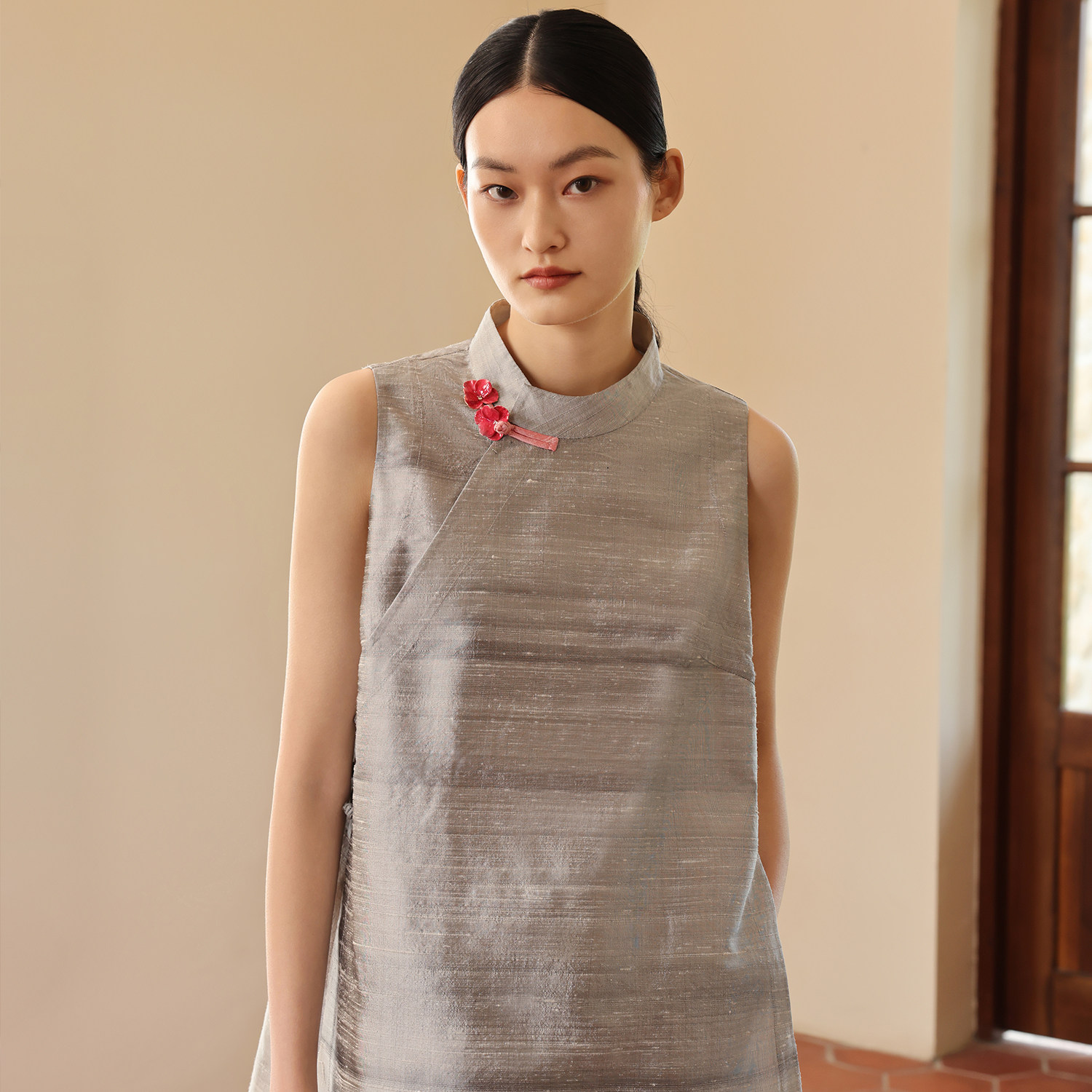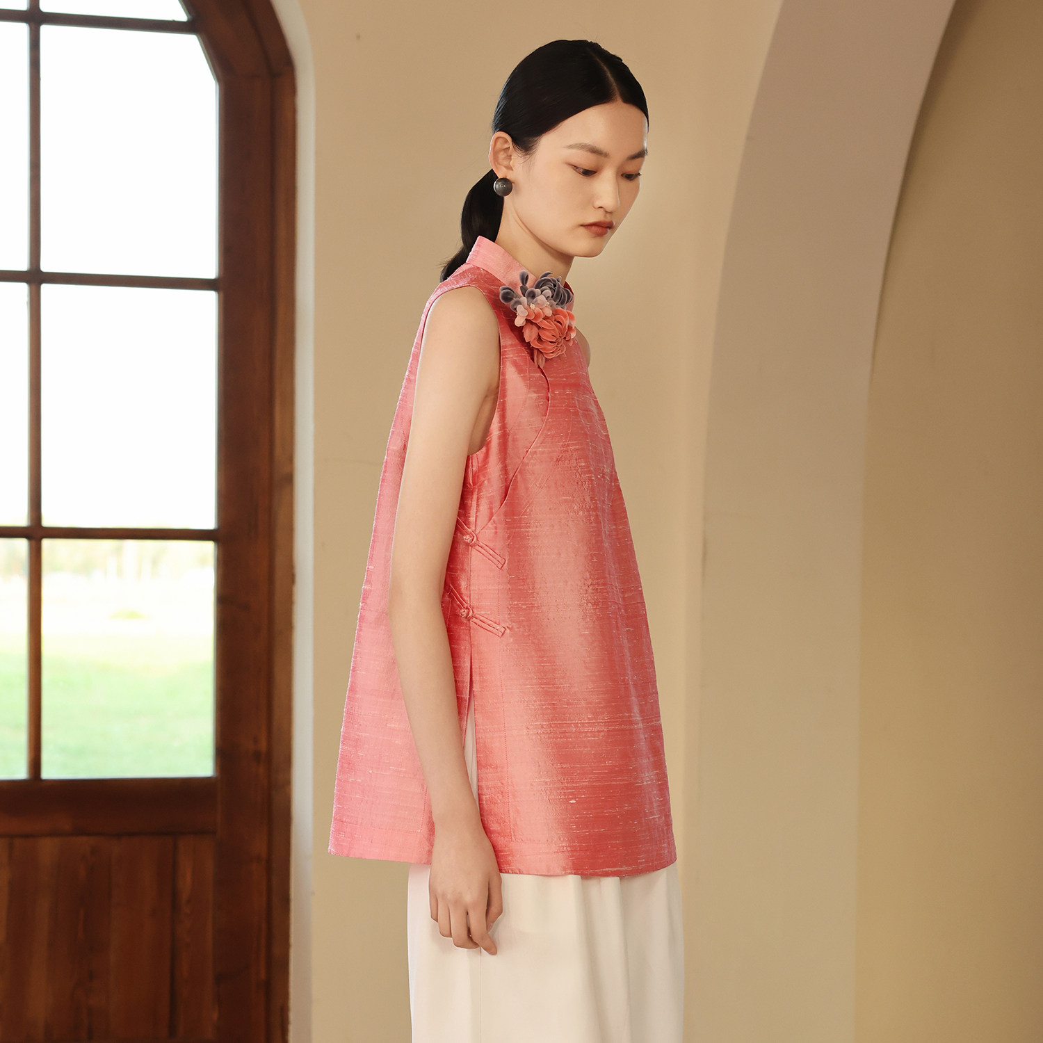 如意连云【绯浔】100%真丝双宫无袖衬衫女新中式国风撞色盘扣上衣