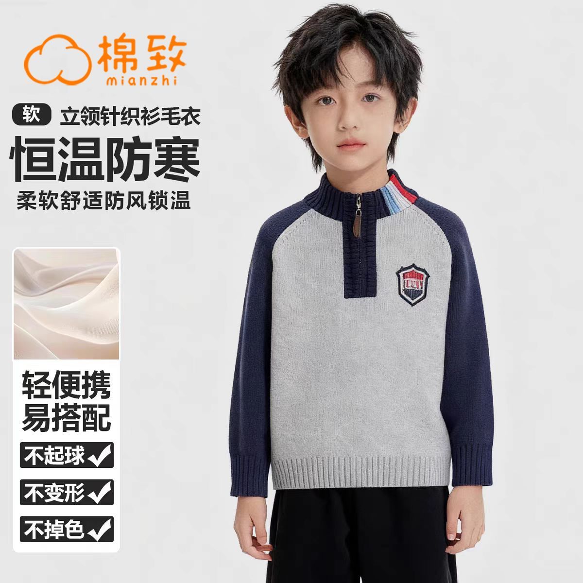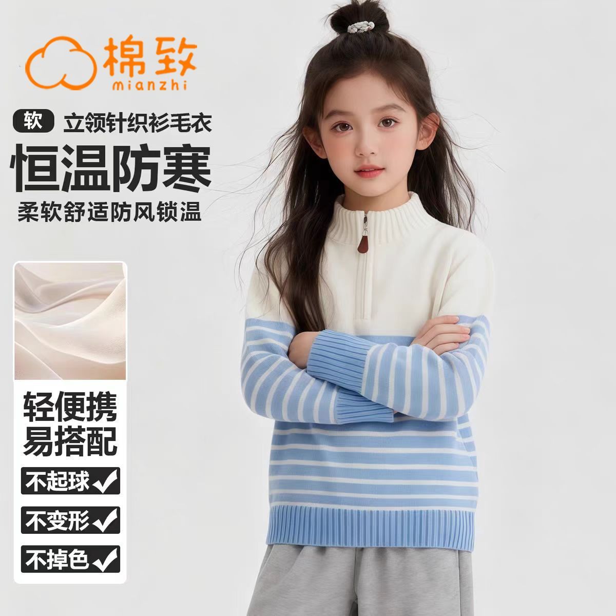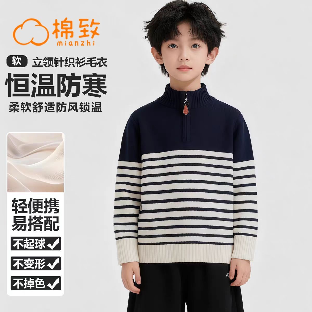 棉致童装男童毛衣拉链拼接条纹打底秋冬新款半高领毛衣内搭针织衫