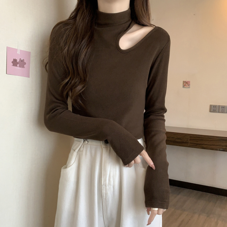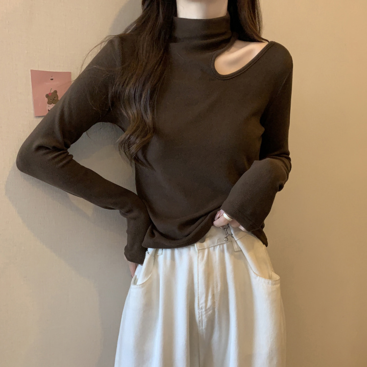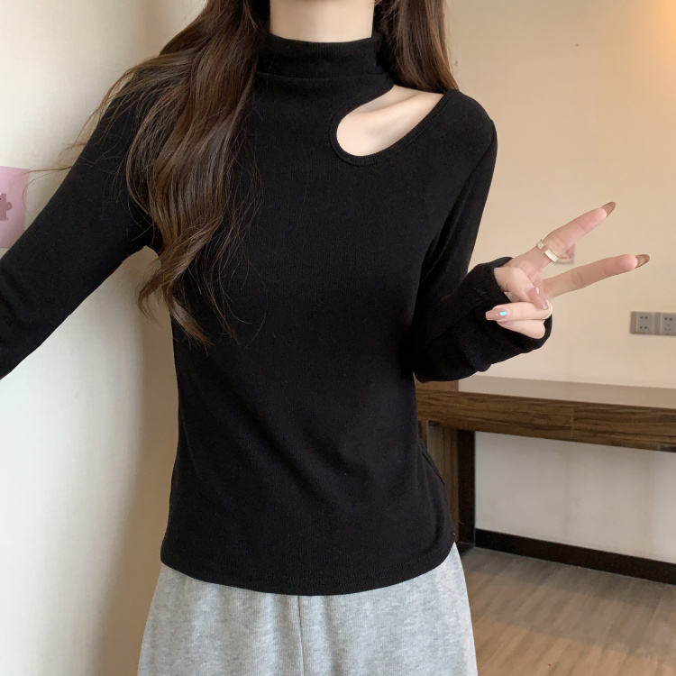 设计感小心机半高领镂空t恤女2024秋冬大码微胖mm宽松显瘦打底衫