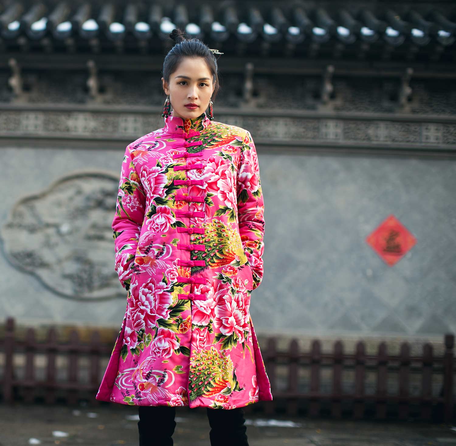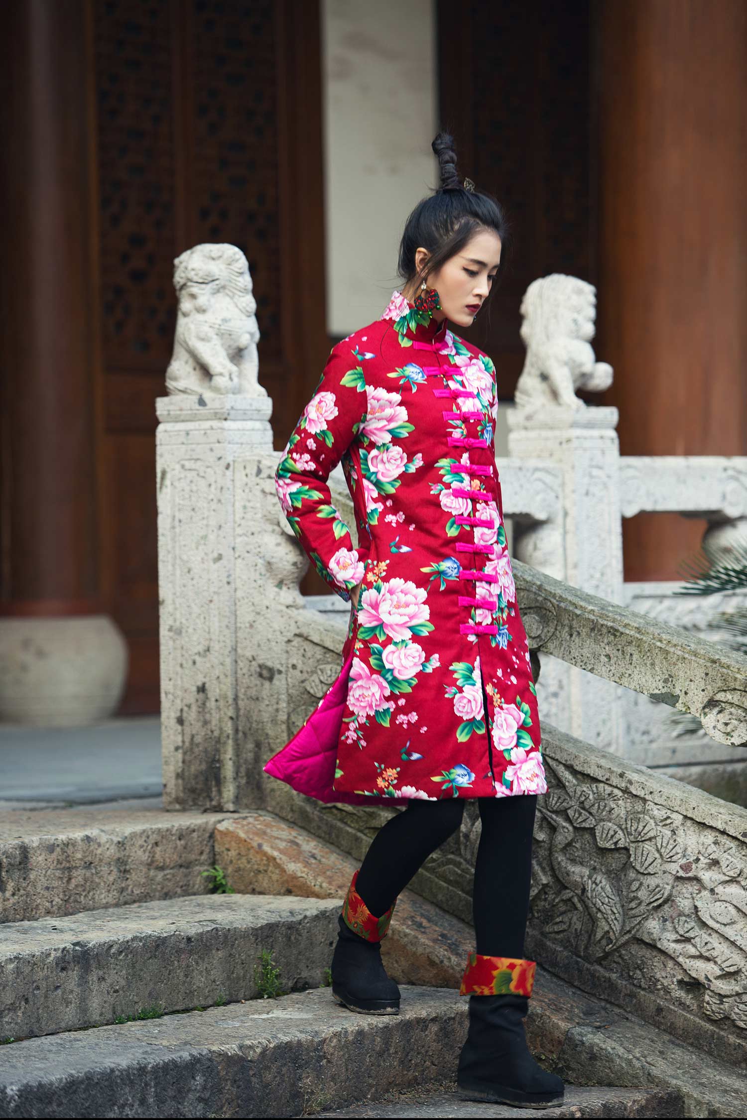 中国风冬季新款盘扣对襟立领中式棉大衣棉袄长款东北大花布棉服