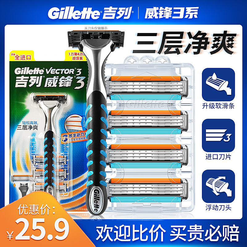 吉列威锋3剃须刀手动男士刮胡刀三层刀片吉列锋速老式1刀架1刀头