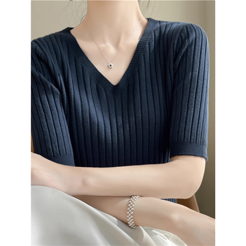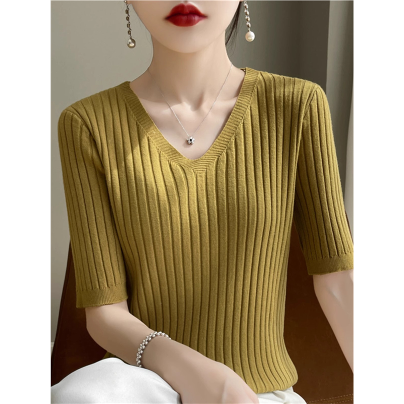 春秋2024新款五分袖打底衫薄款中袖毛衣V领针织衫宽松配西装内搭