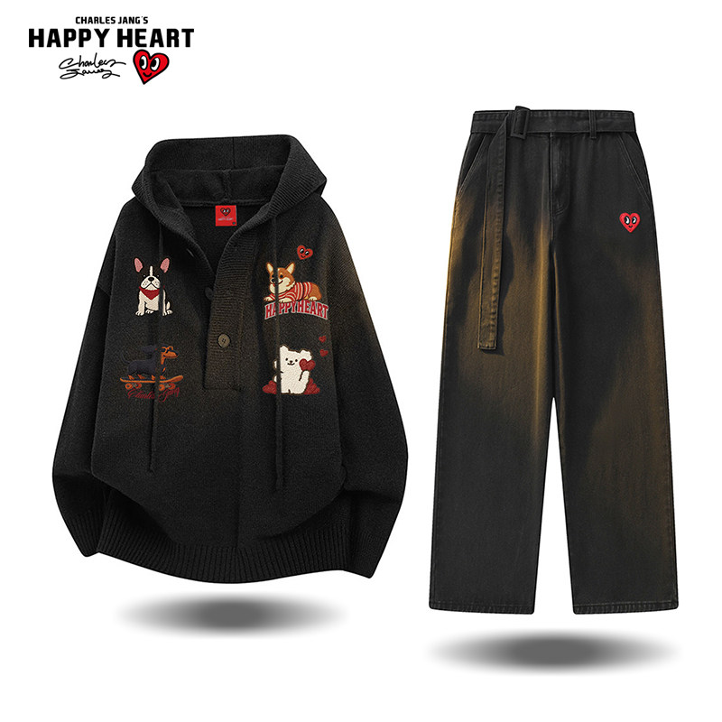 查尔斯桃心 宠物狗印花连帽毛衣套装男秋冬季针织衫直筒休闲长裤