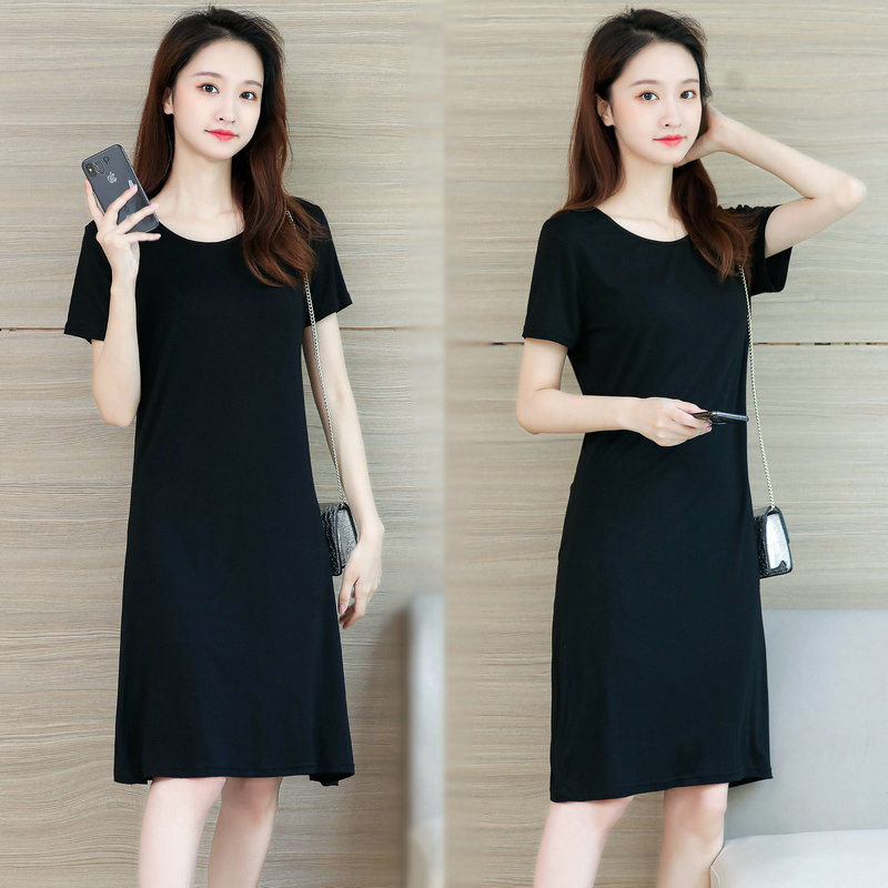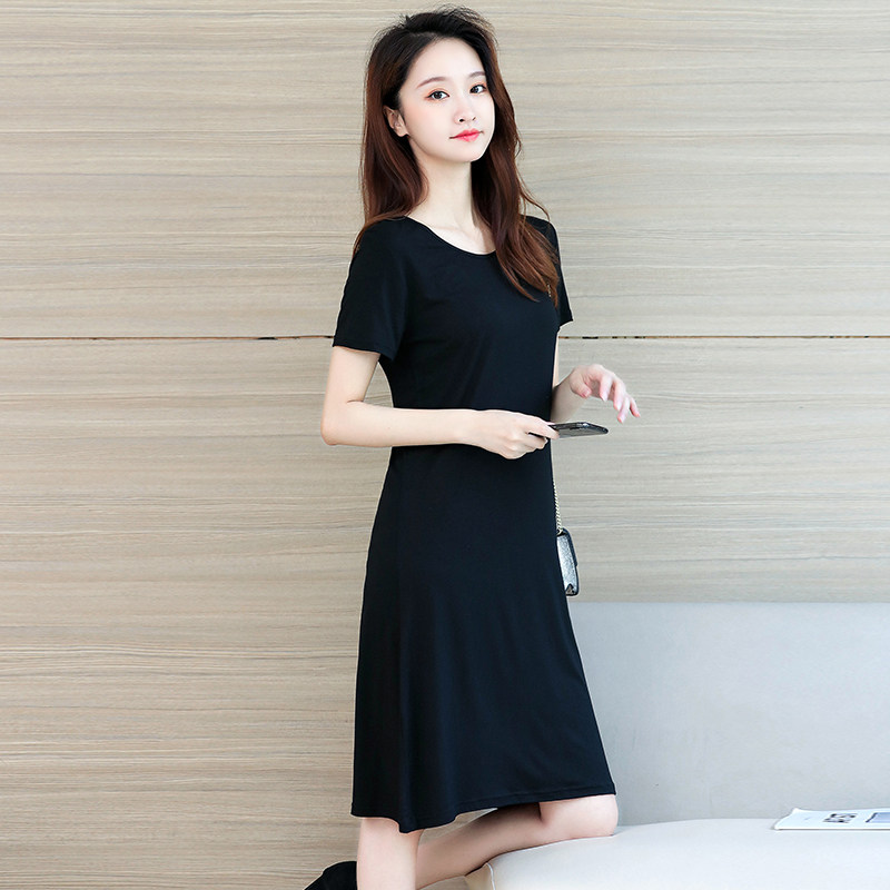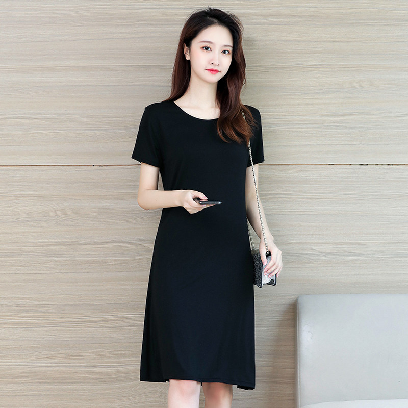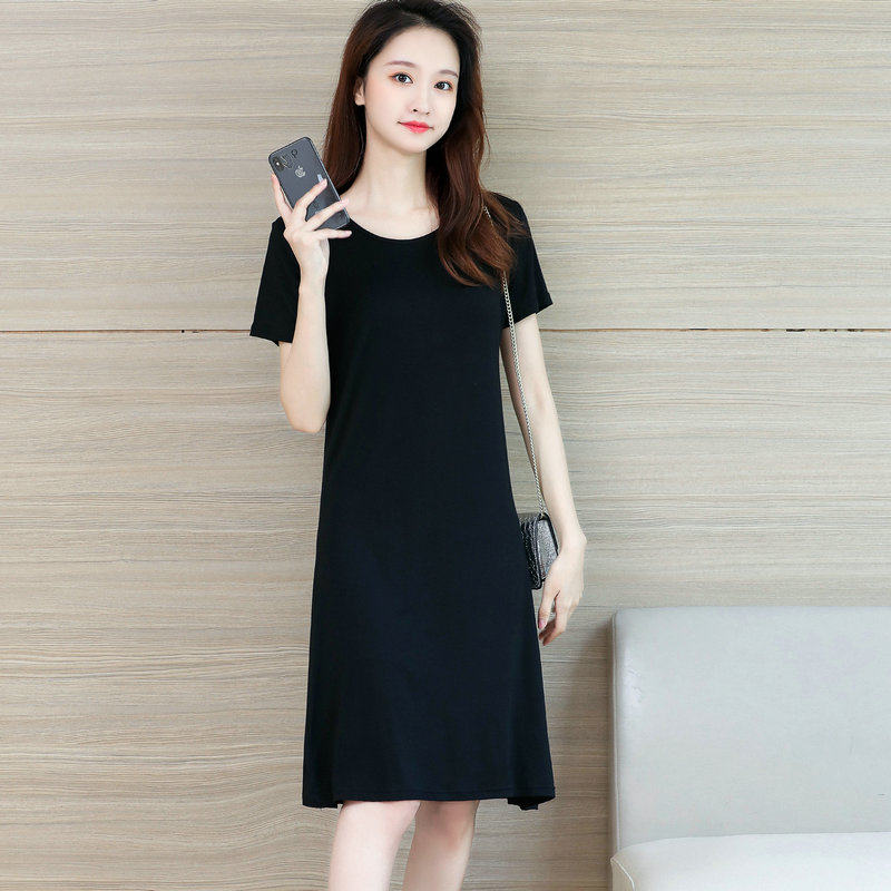 莫代尔圆领连衣裙女夏装中长款短袖T恤显瘦打底裙大码百搭休闲裙