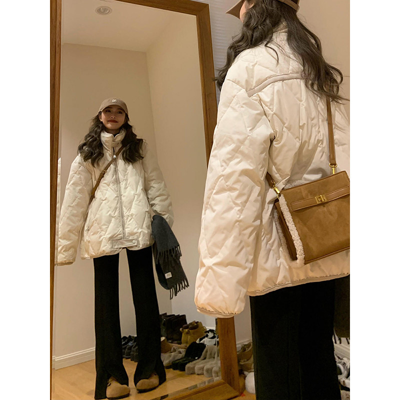 300斤特大码胖mm日系菱格棉服外套女冬季百搭设计感保暖加厚棉衣