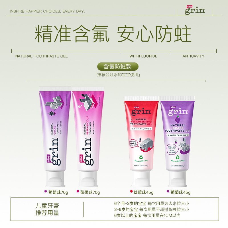 grin儿童牙膏含氟可防蛀婴儿0到3岁3-6-12岁以上换牙期宝宝牙膏