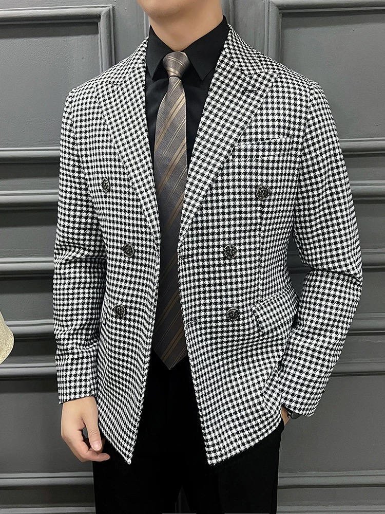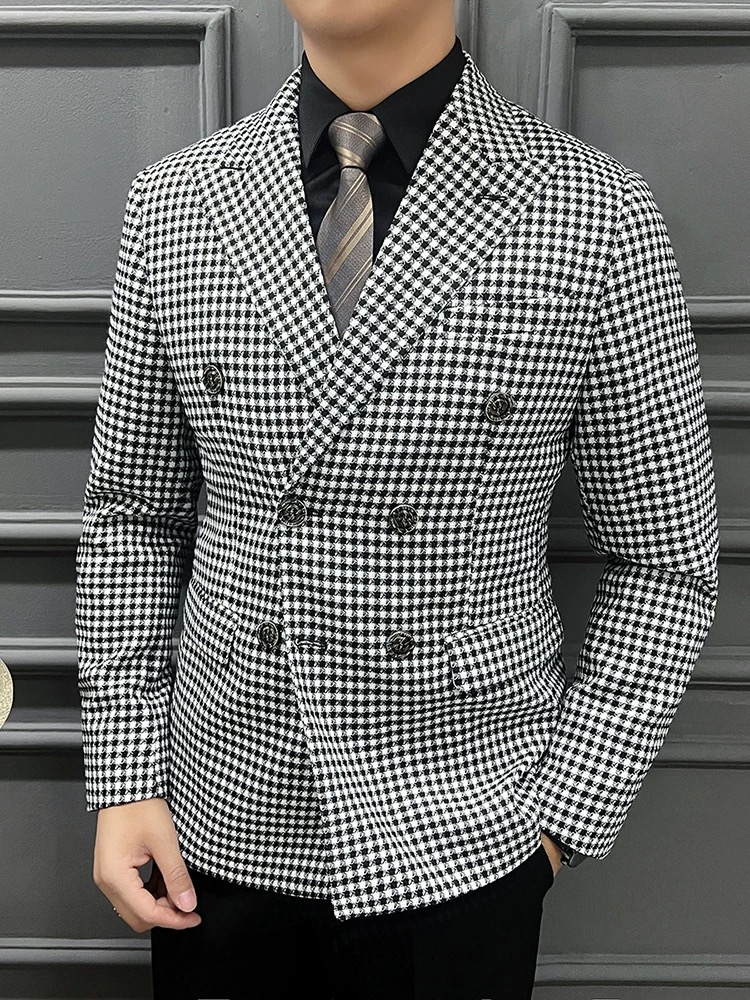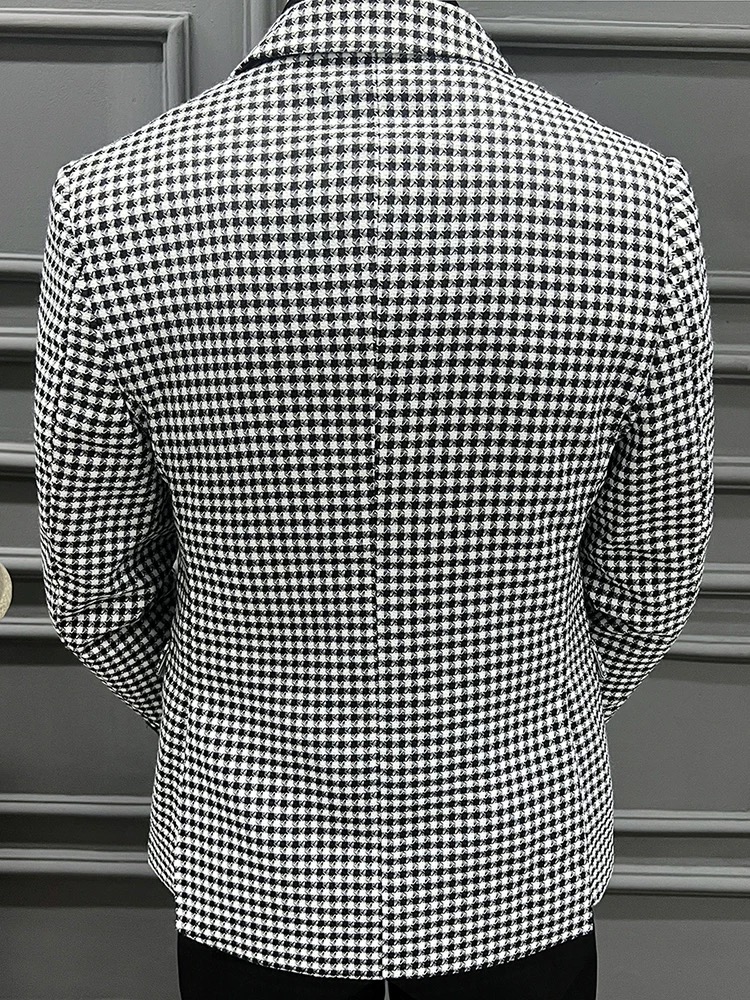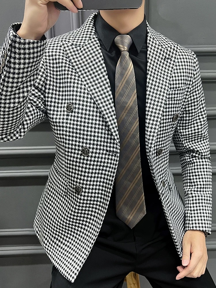 男士格子西装高端双开叉两粒单排扣短款千鸟格单西韩版修身男上衣