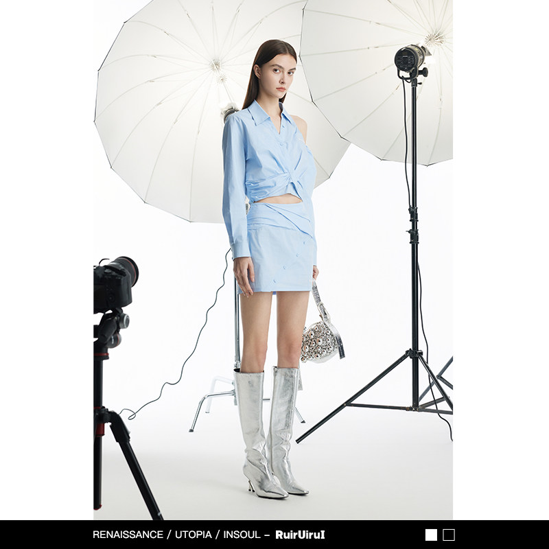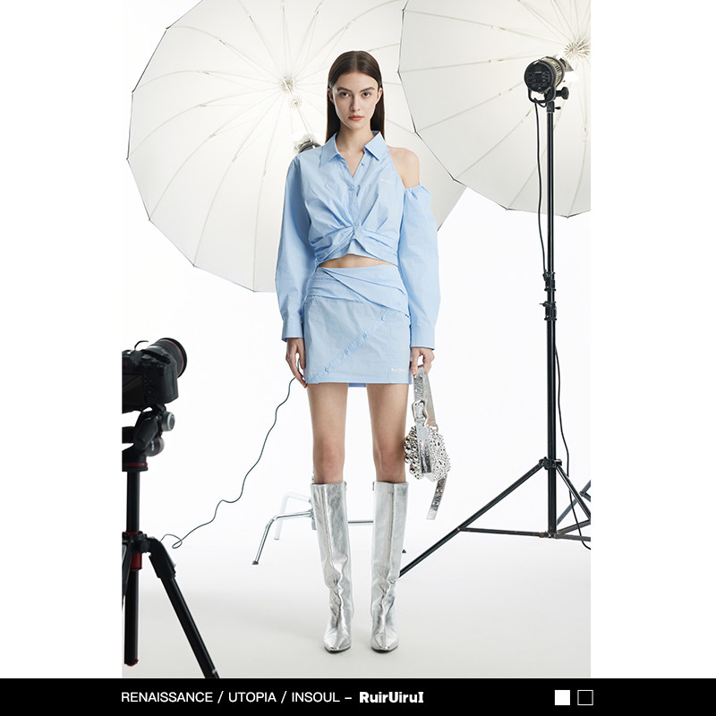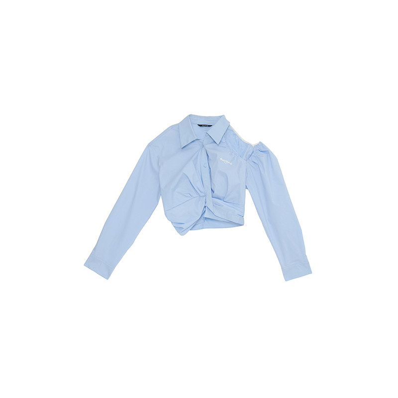 RuirUiruI蓝色挖肩衬衫秋季新品纽结收腰棉涤通勤显瘦气质短衬衣