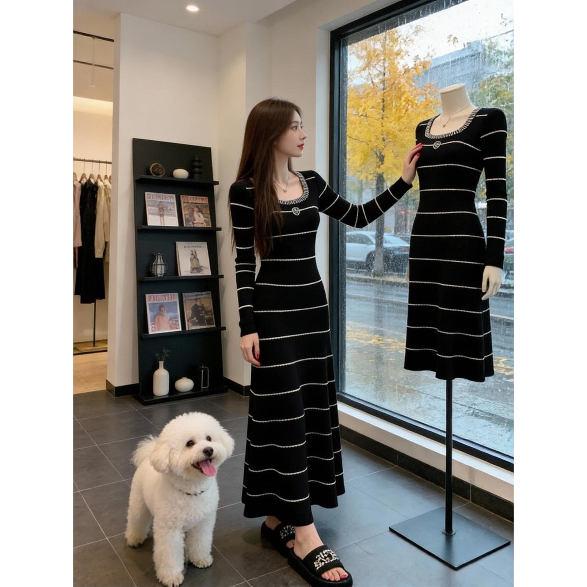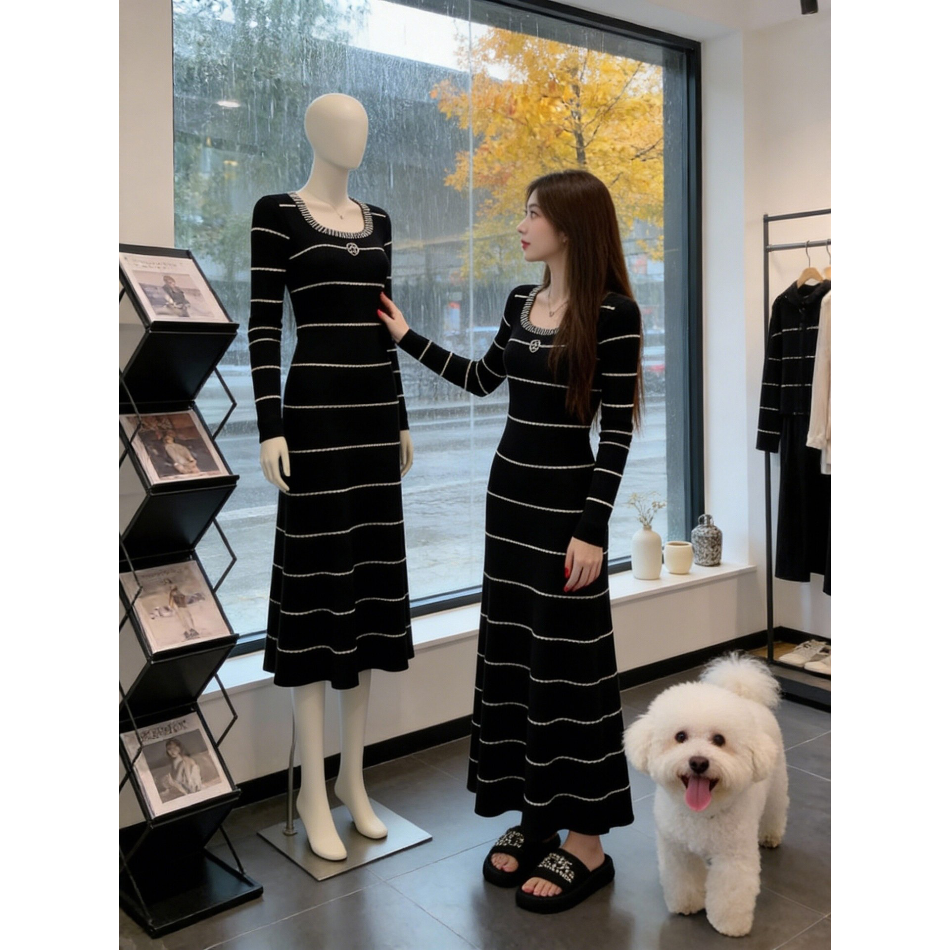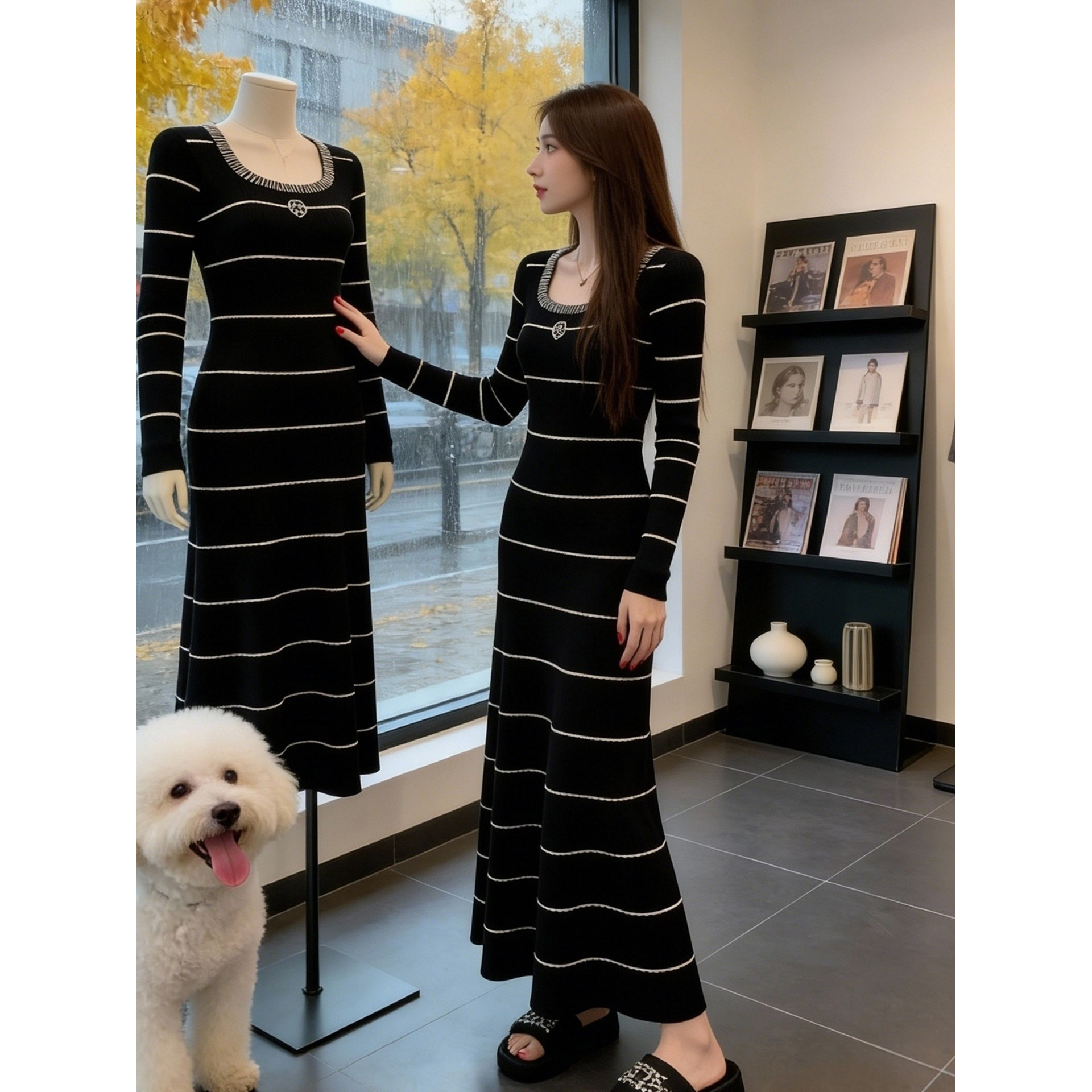 韩国简约撞色条纹V领针织连衣裙女2025秋冬修身显瘦法式气质长裙