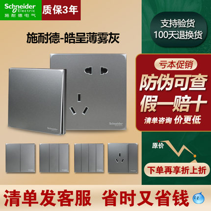 施耐德开关插座皓呈薄雾灰色10A五孔带一开空调16A大面板暗装86型