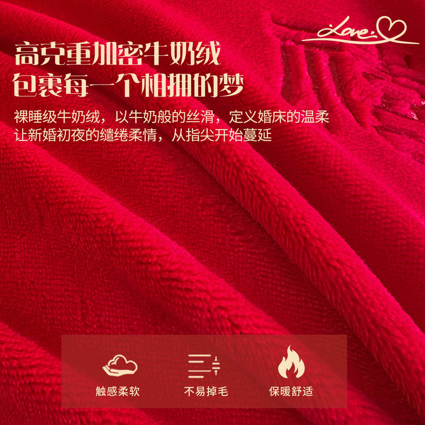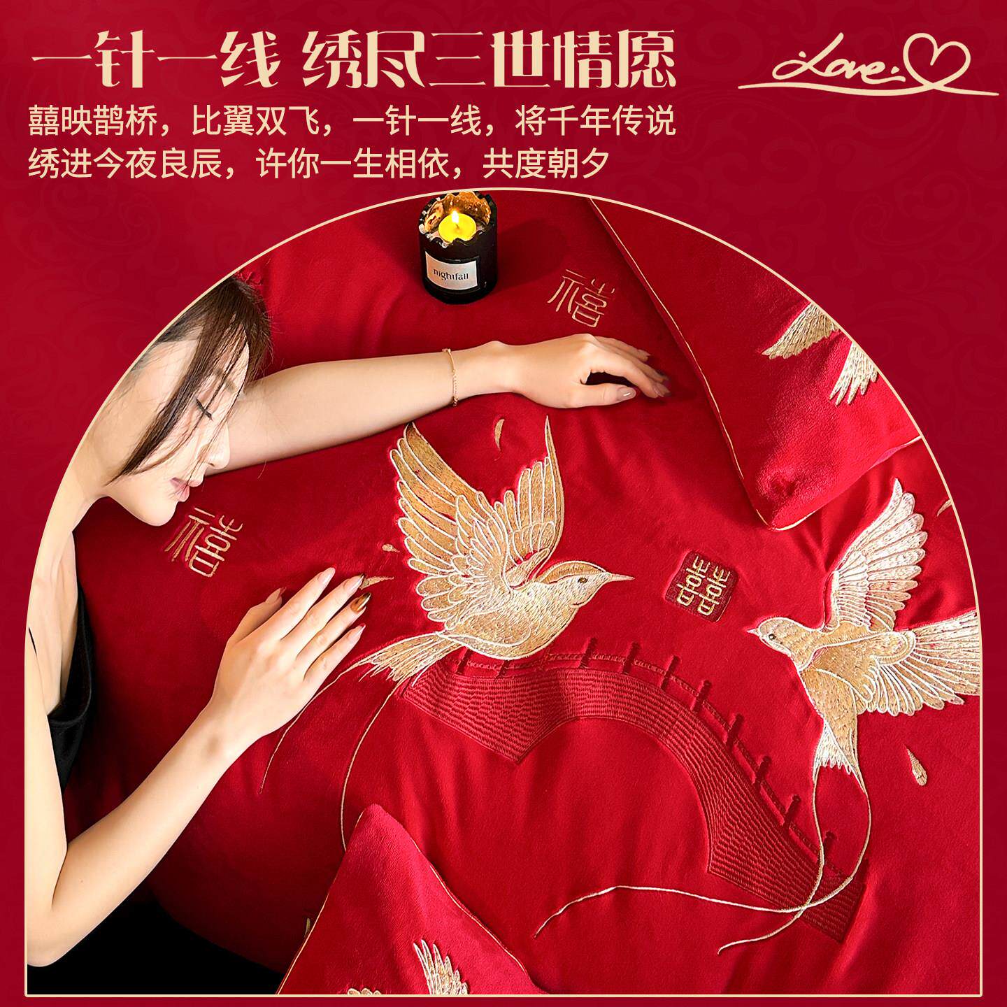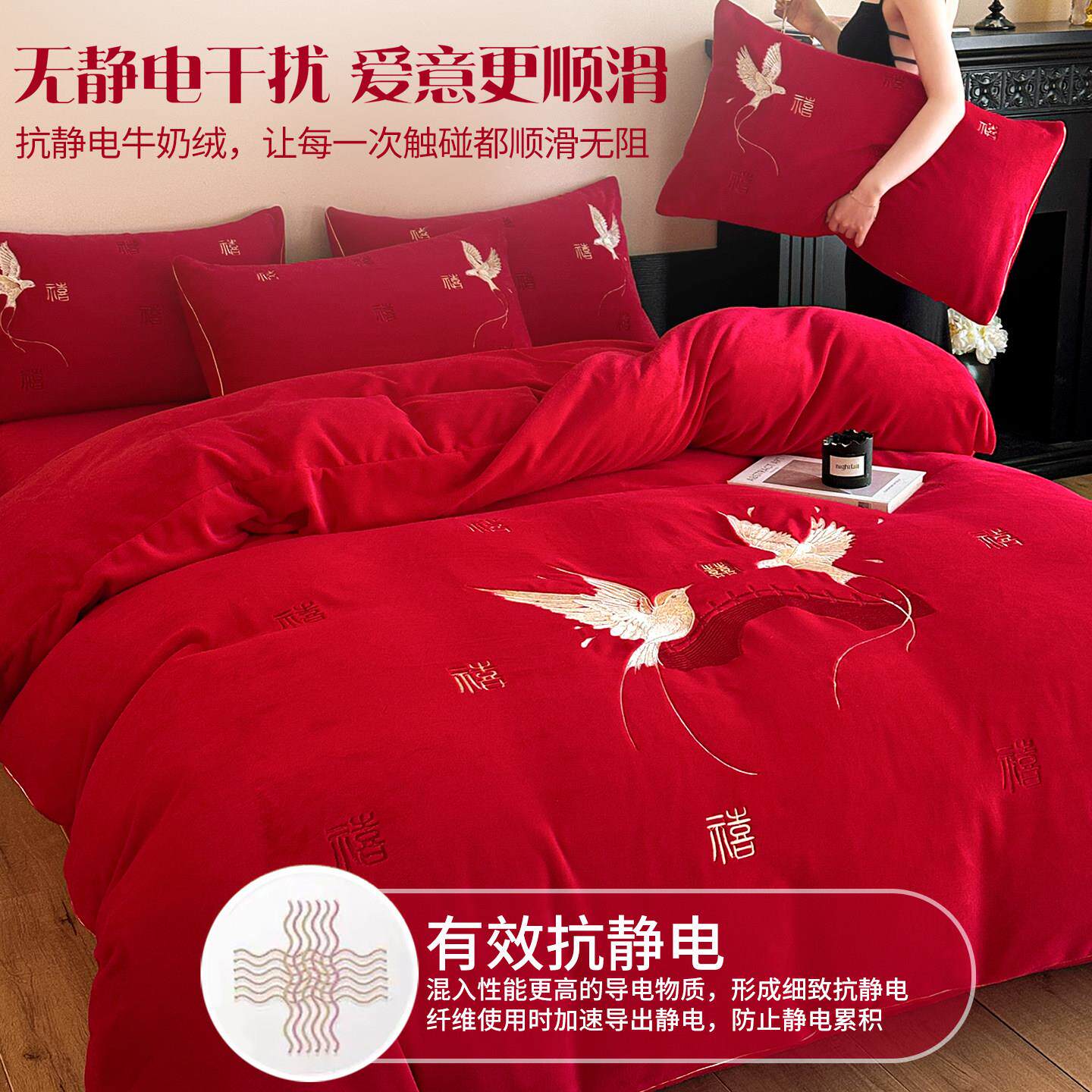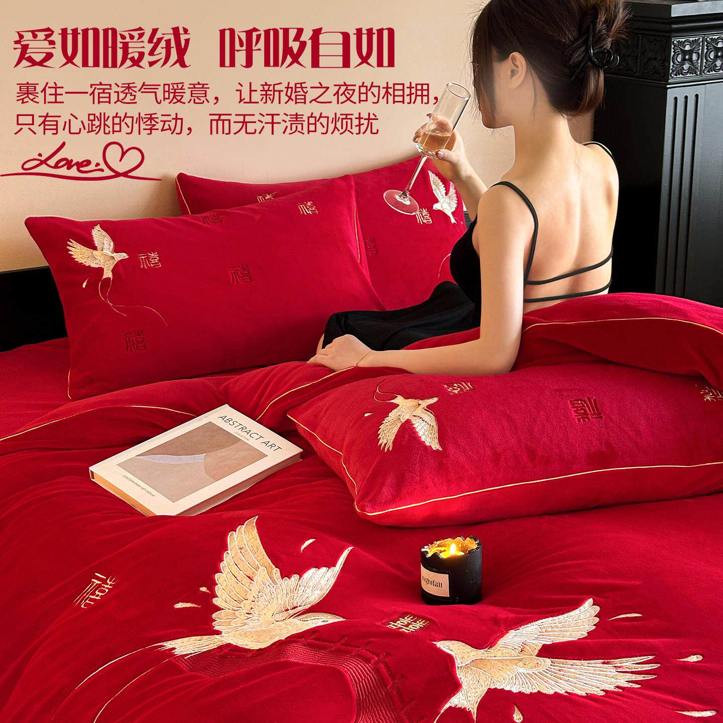 冬天婚庆结婚四件套牛奶绒红色陪嫁毛绒床单被套加绒新婚床上用品