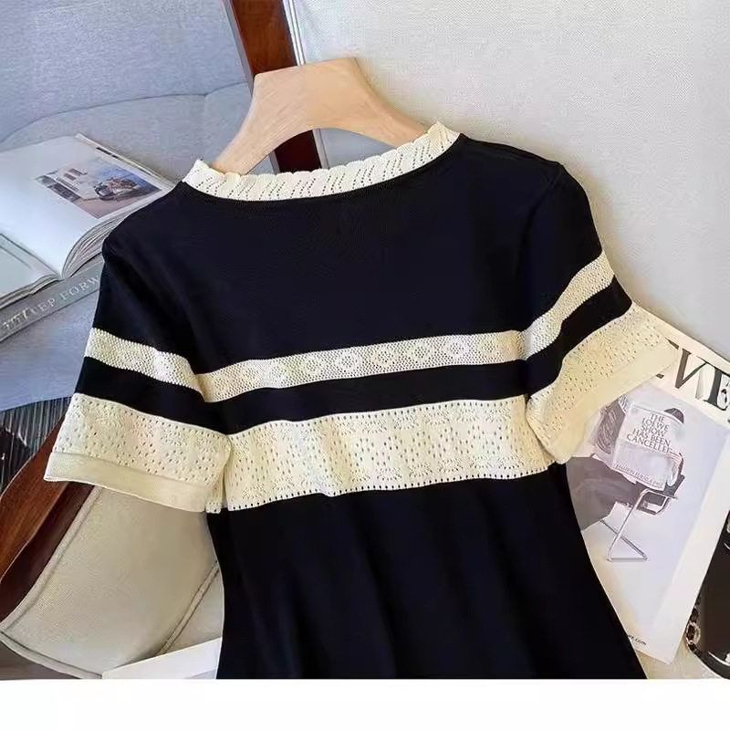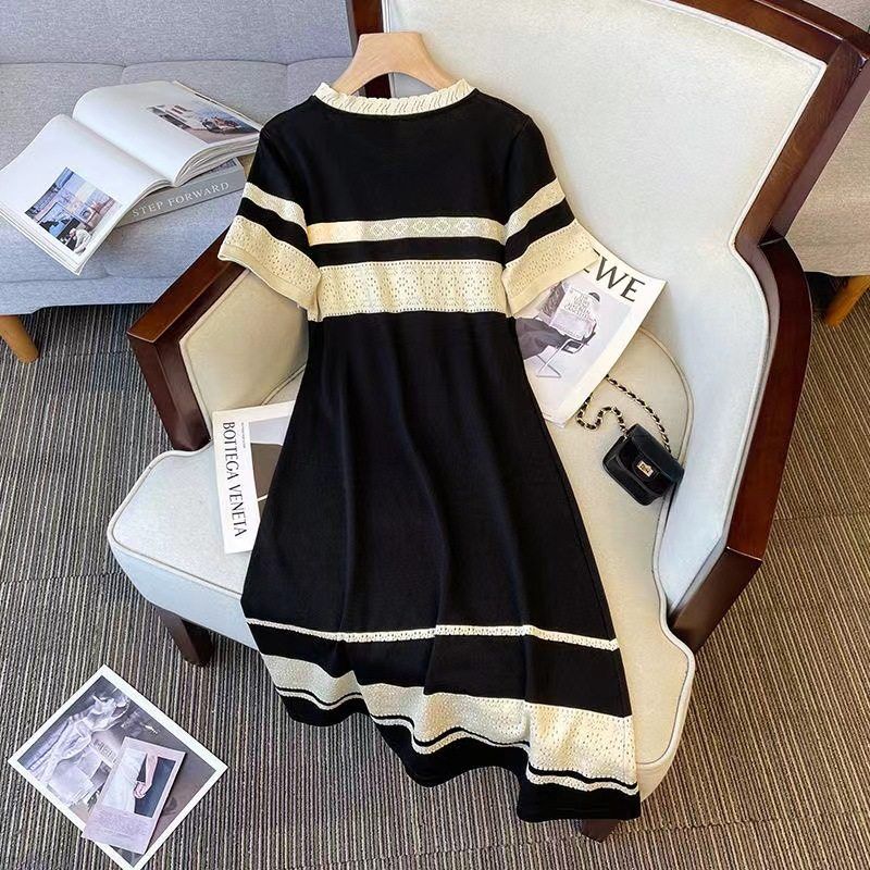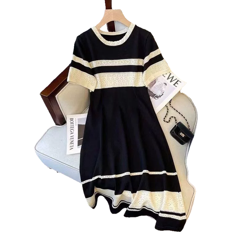 韩版女圆领显瘦裙子短袖连衣裙设计感夏季黑色修身新款中长款