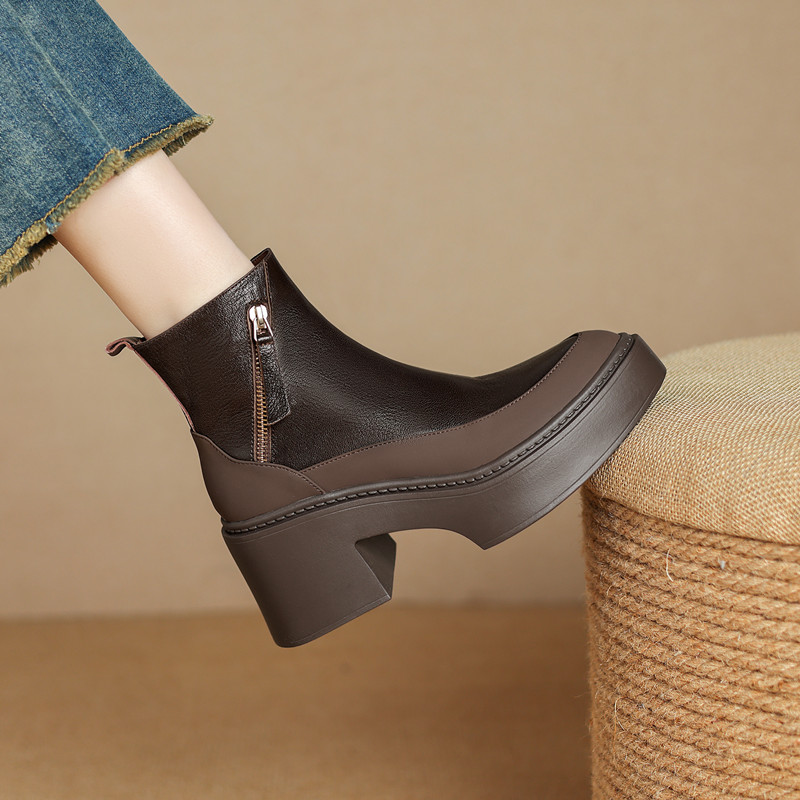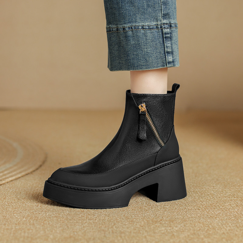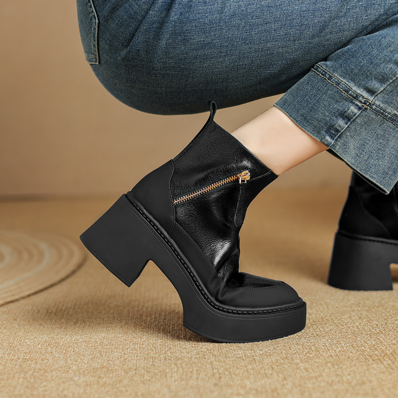 厚底短靴女2024新款超高跟防水台马丁靴显瘦复古粗跟圆头真皮短靴