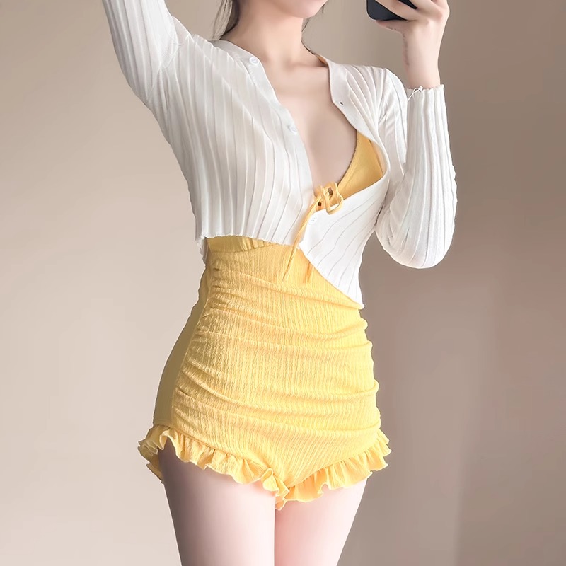 特价ins少女连体比基尼荷叶边v领无钢托纯色简约性感露背温泉泳衣