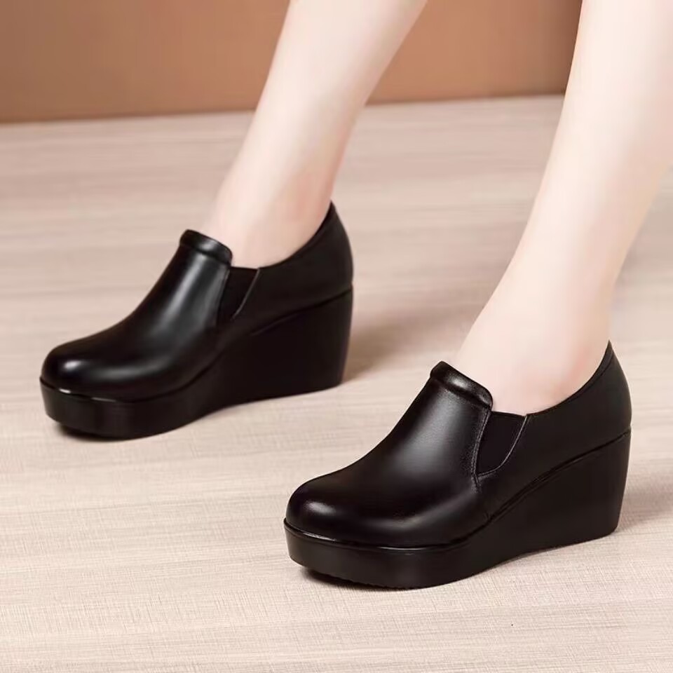 坡跟深口单鞋女秋冬季款圆头中跟松糕厚底防水台加绒一脚蹬妈妈鞋