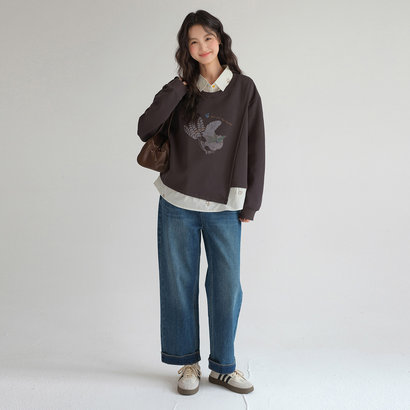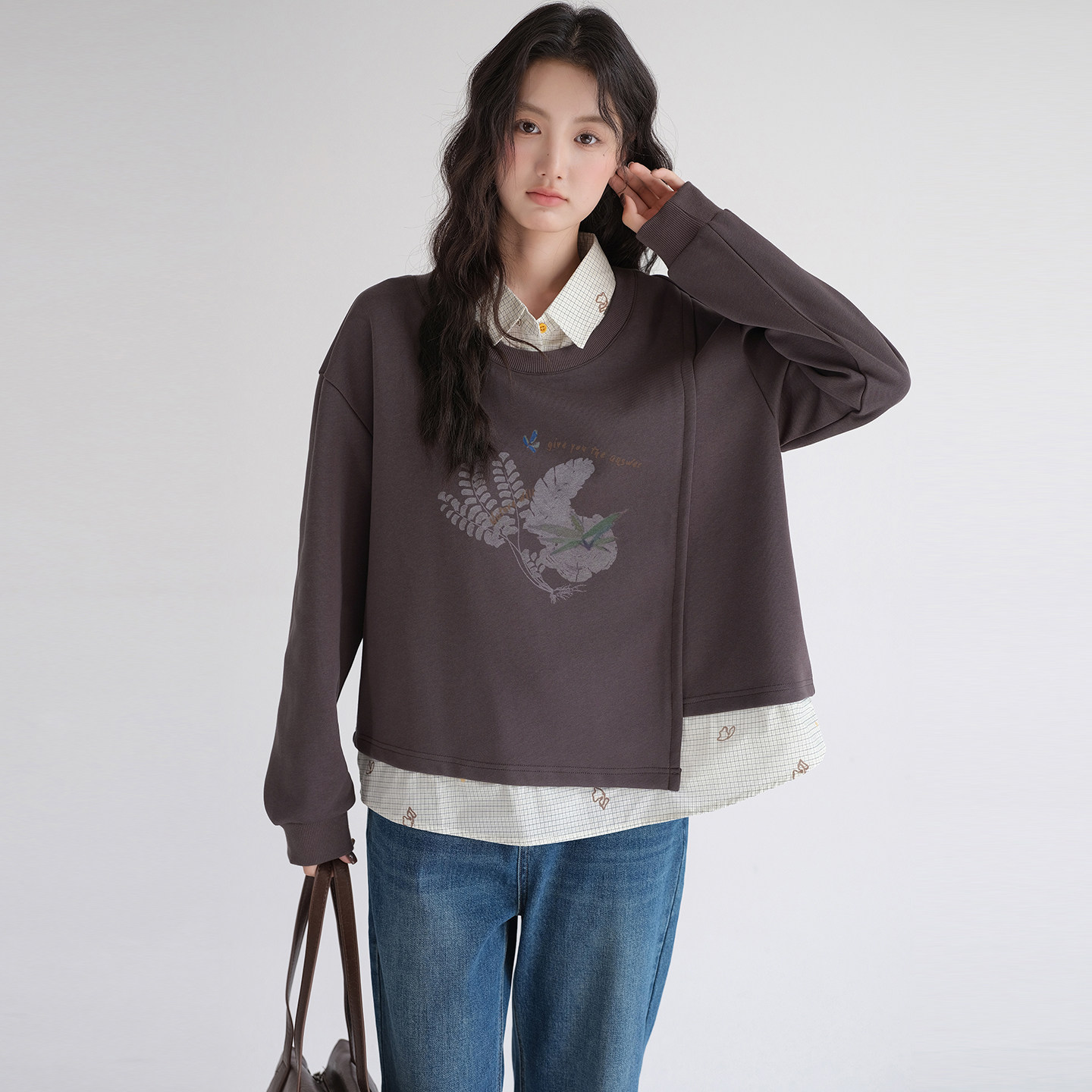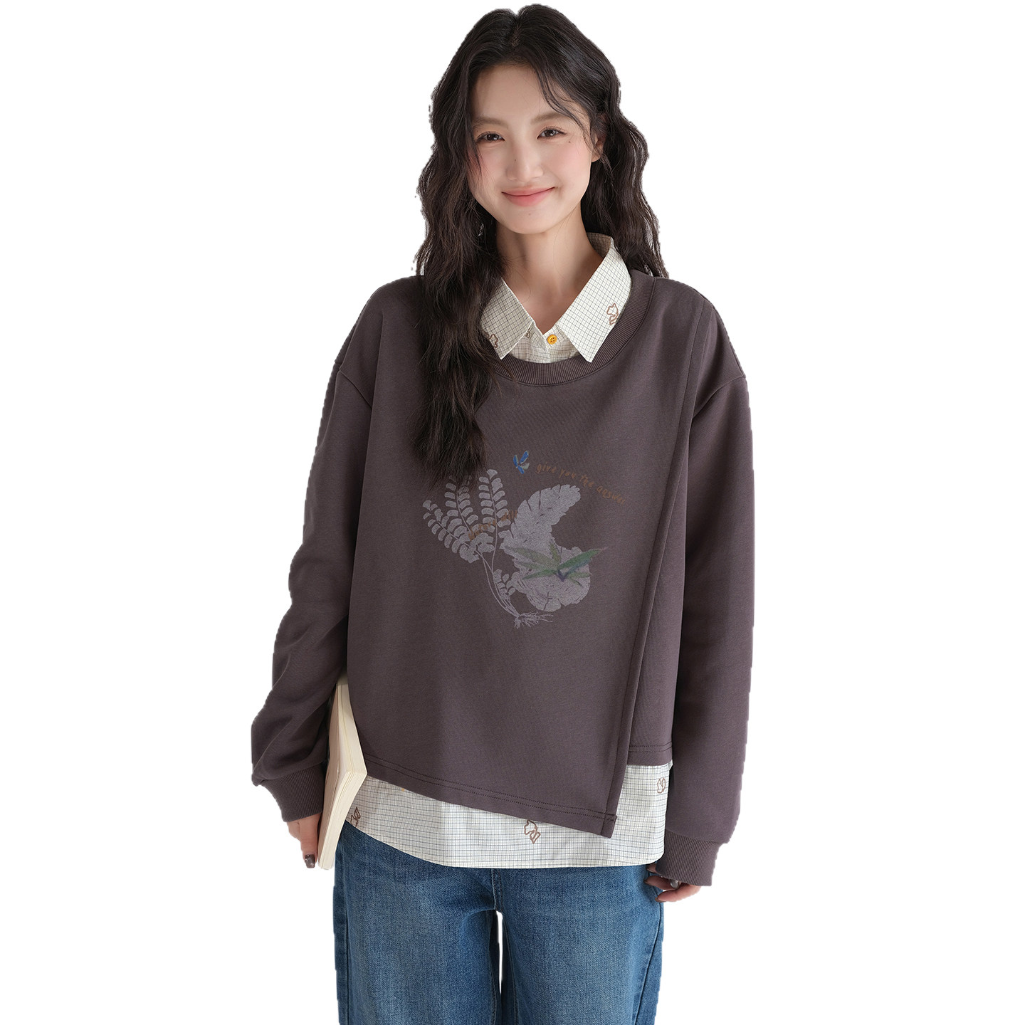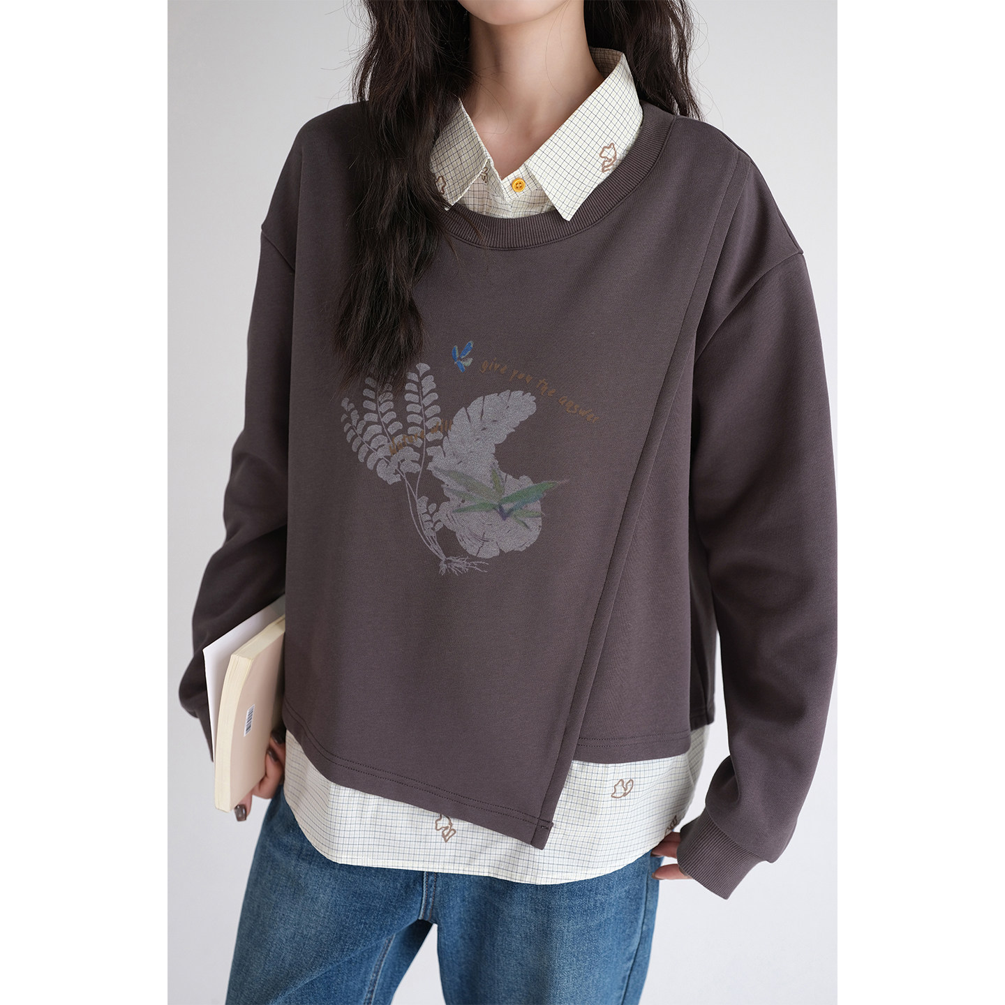 【朦胧感印花假两件卫衣】蓝若水大码2026春装新款显瘦衬衫领上衣