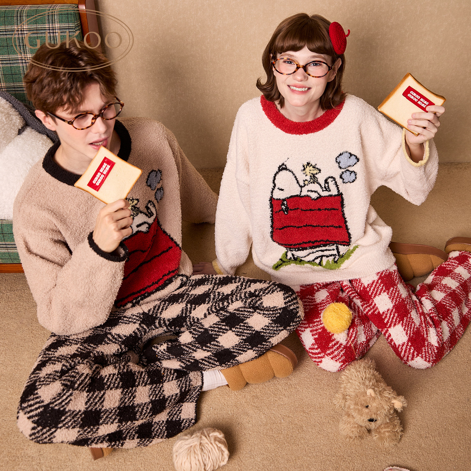 Gukoo果壳情侣半边绒睡衣冬季新款红色新年女睡衣史努比男家居服D
