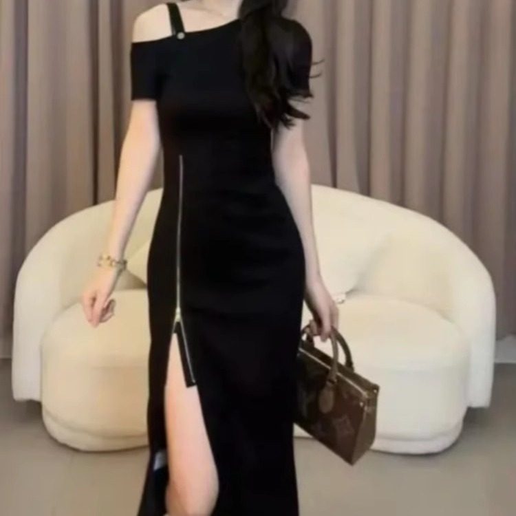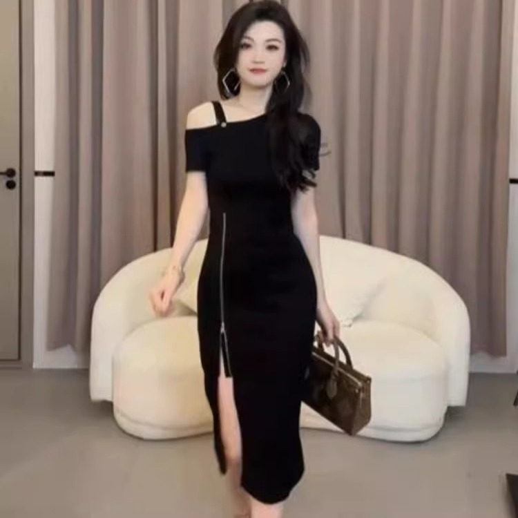 欧货设计感斜肩显瘦性感短袖连衣裙女夏季新款气质开叉休闲长裙子
