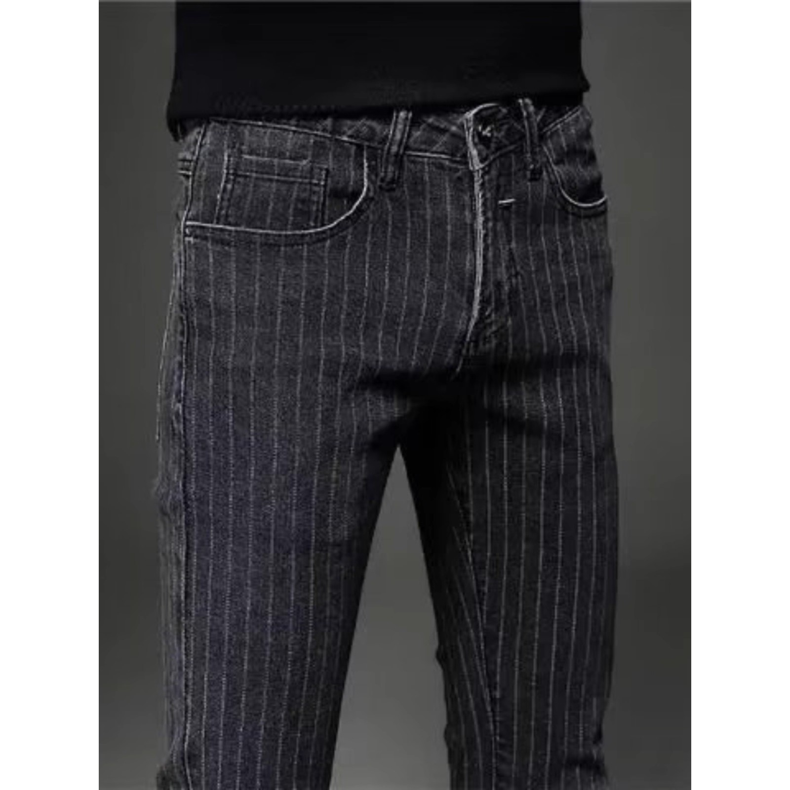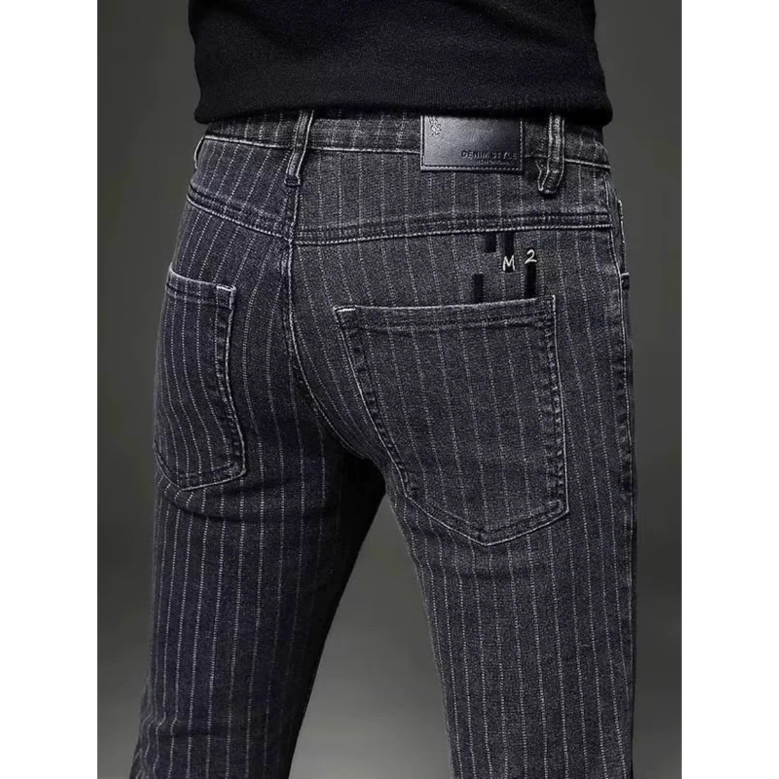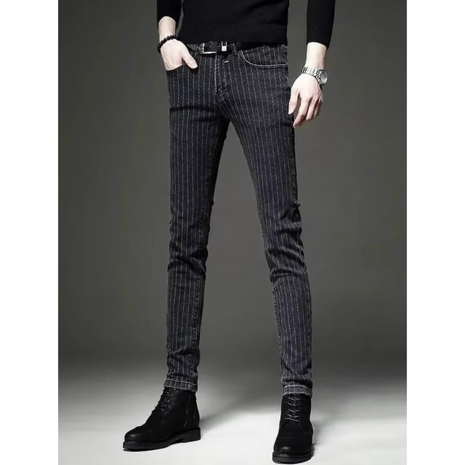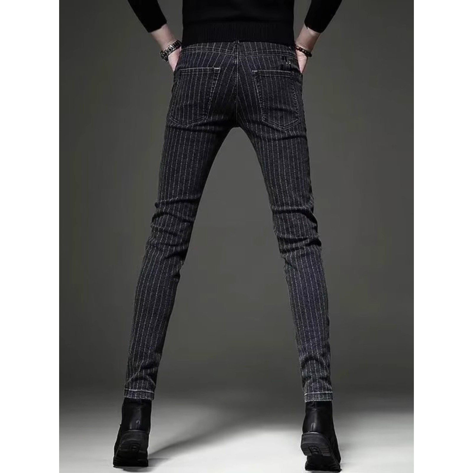 春秋季新款高端潮牌水洗条纹牛仔裤男修身小脚黑色韩版弹力长裤男