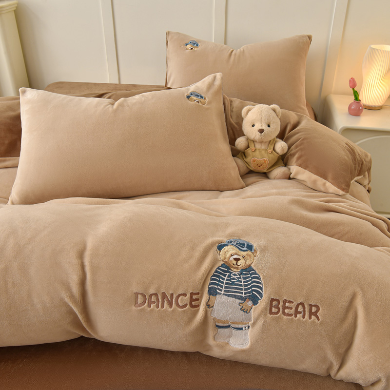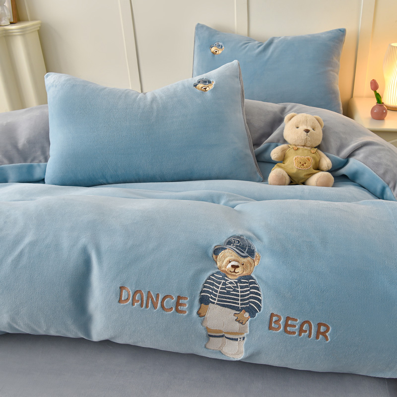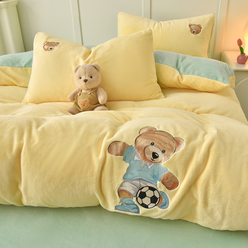卡通小熊牛奶绒四件套绿色可爱儿童床品加厚双面绒被套床单珊瑚绒