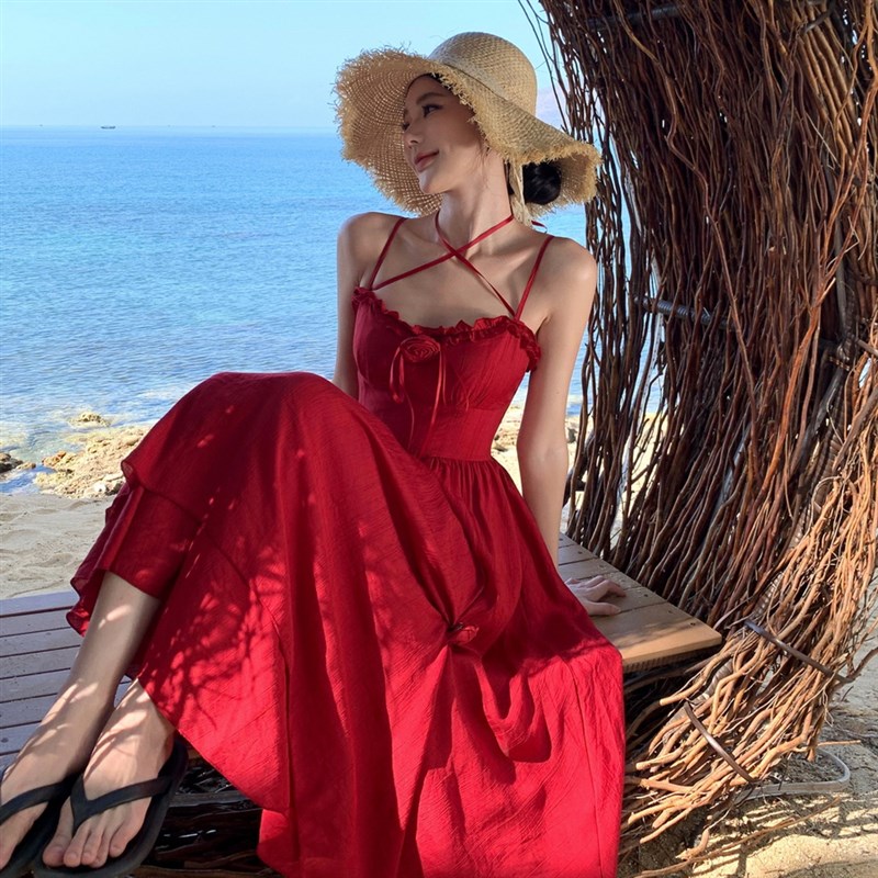 速发三亚度假旅行拍照气质浪漫红色玫瑰系带大摆收腰吊带连衣裙夏