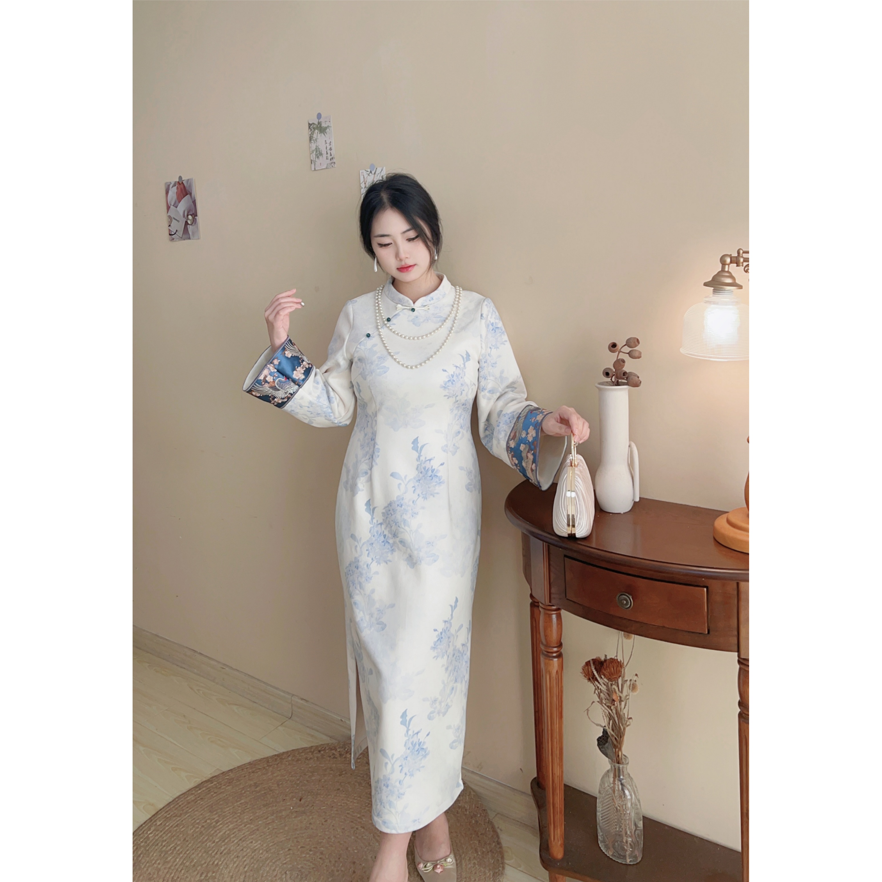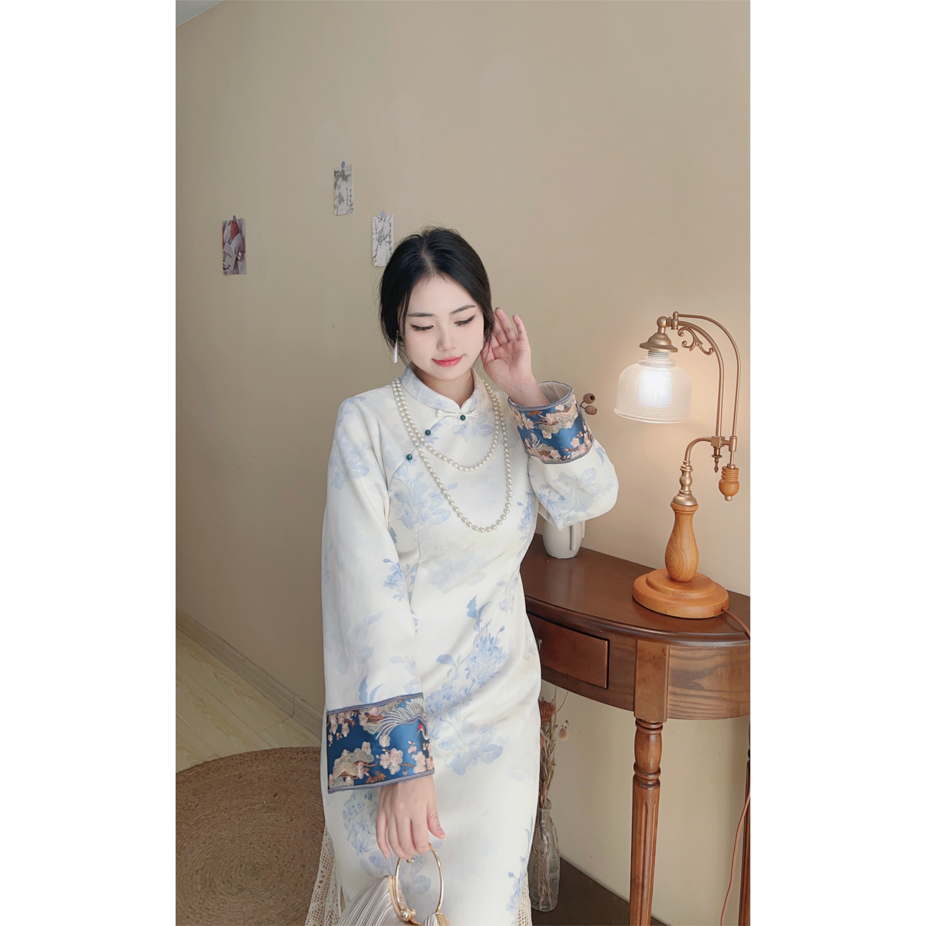 加绒【自制款】遇见大码胖mm青花瓷秋冬高端加厚刺绣旗袍连衣裙冬