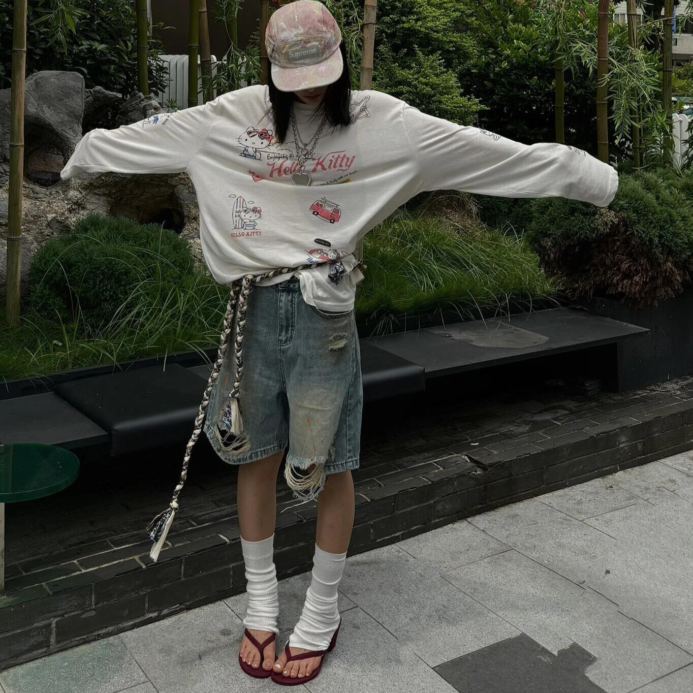 慵懒风卡通Kitty猫咪印花长袖t恤