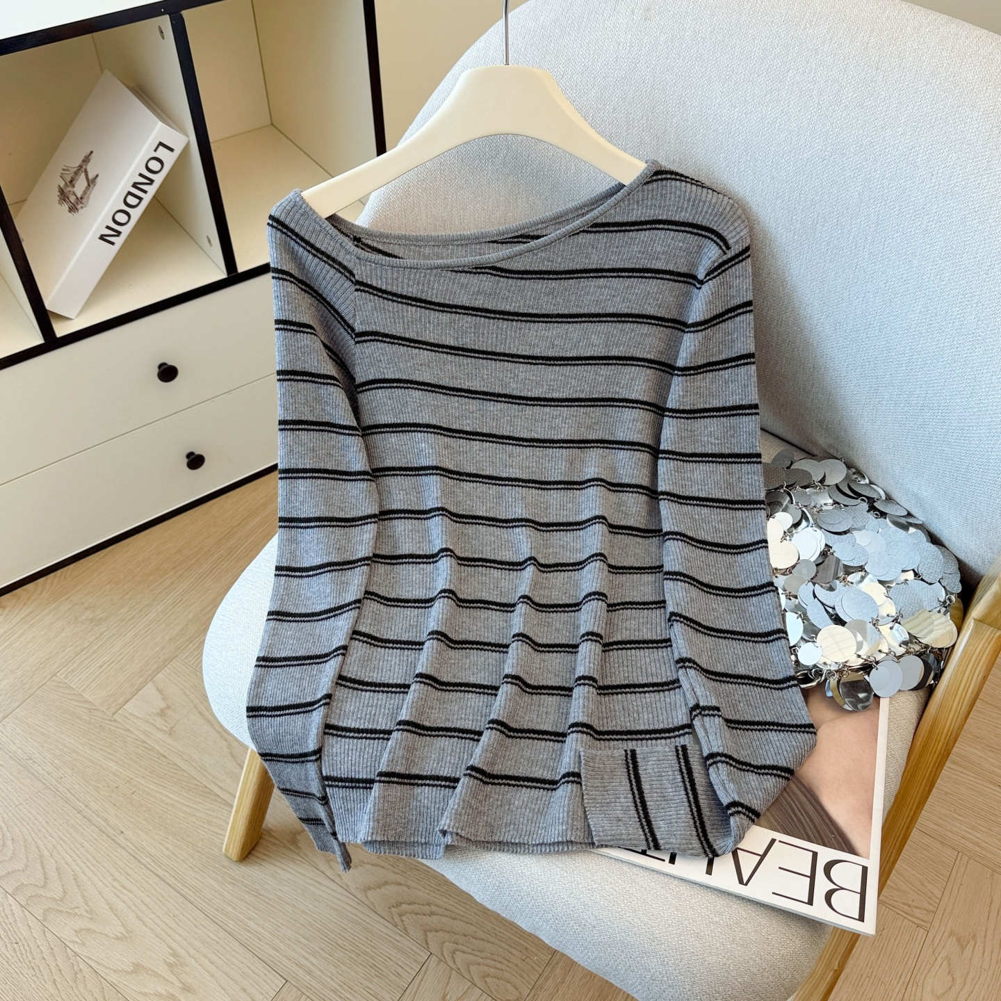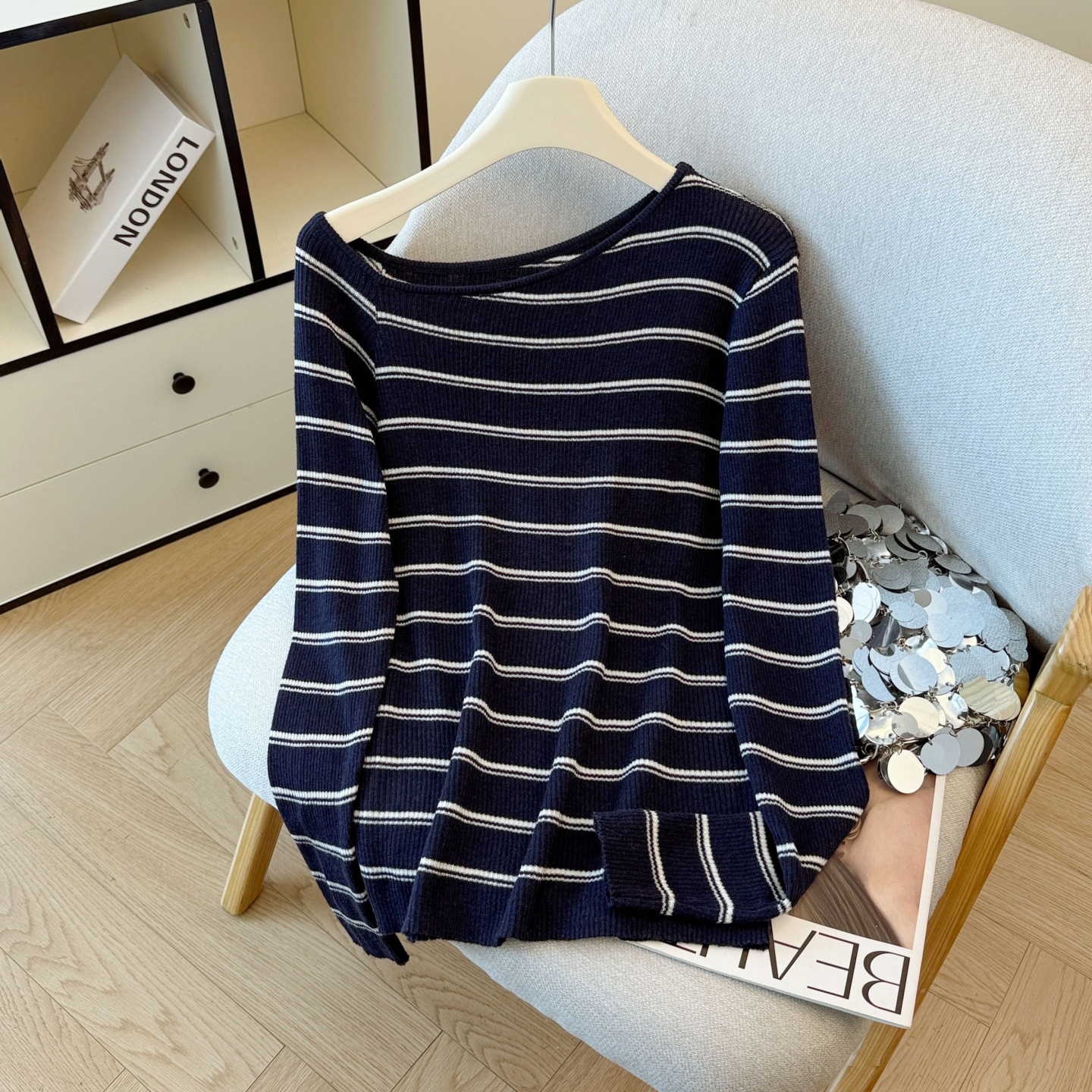 XXXS加小码秋季女装小个子150cm显高斜肩条纹长袖针织衫打底露肩