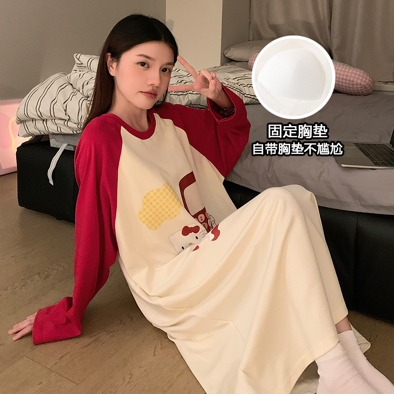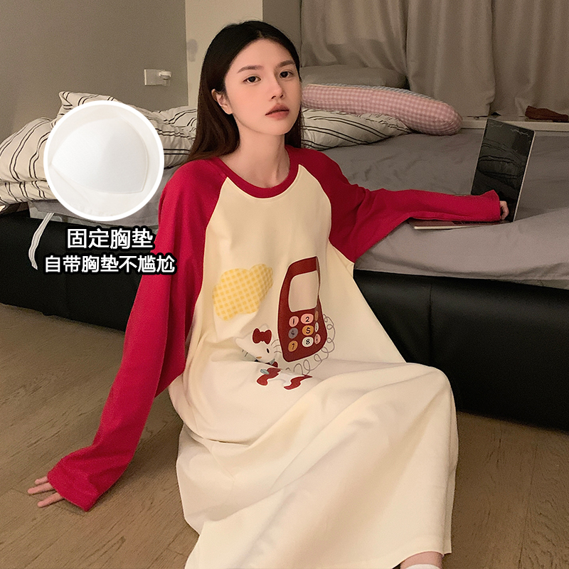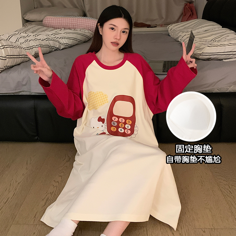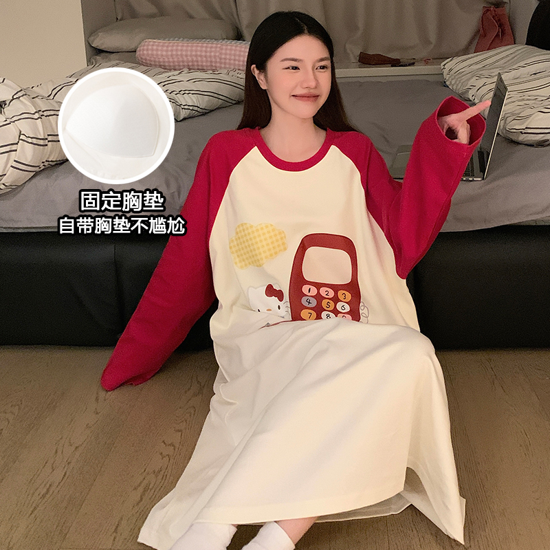 女士睡裙春秋季长袖2025年新款带胸垫纯棉网红大码孕妇家居服睡衣