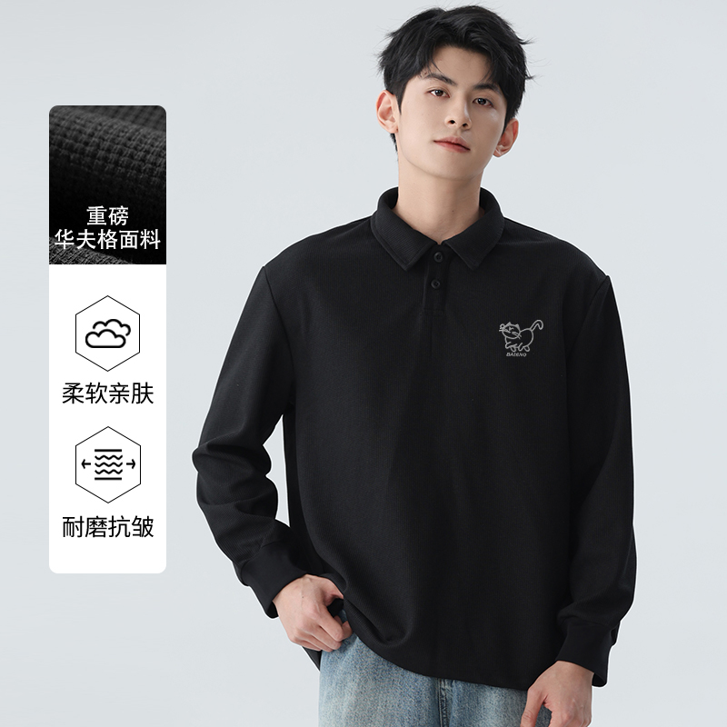 班尼路黑色polo衫男春季青少年小猫标长袖翻领体恤男士痞帅上衣A