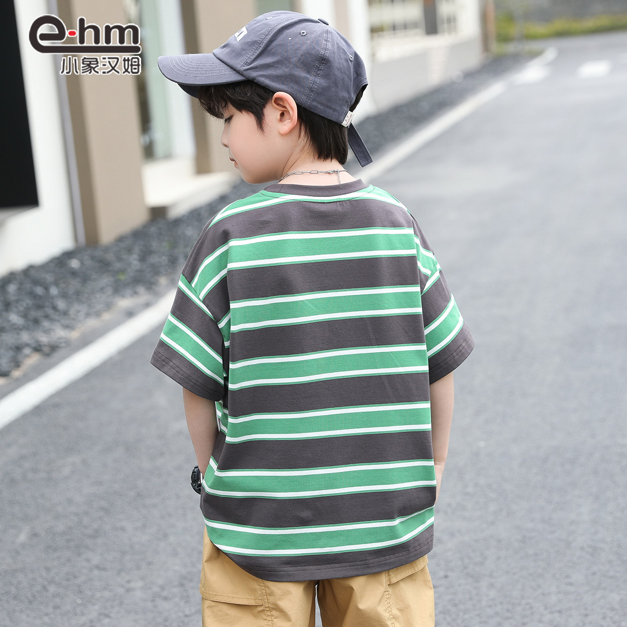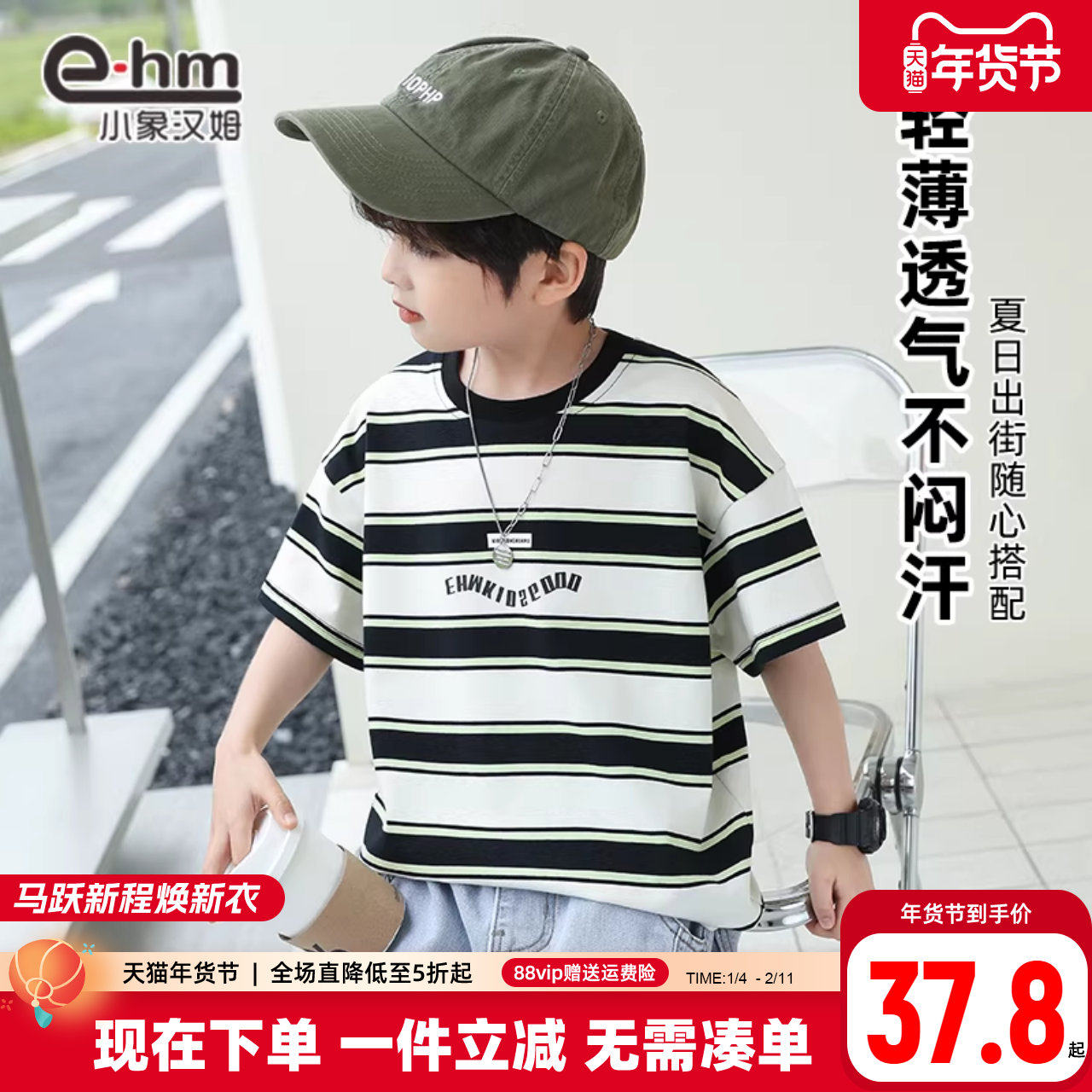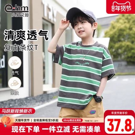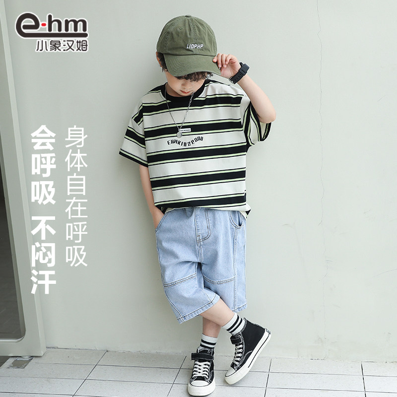小象汉姆童装男童短袖T恤条纹儿童体恤衫半袖圆领2025夏装新款潮