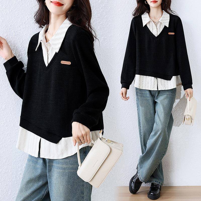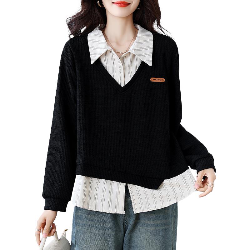 九月墨陌假两件POLO领卫衣女秋季新款不规则条纹衬衫拼接翻领上衣